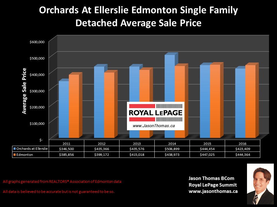 Visit Orchards at Ellerslie homes for sale in Edmonton, to see all the currently listed real estate in this south side neighbourhood.  The average selling price for a house in Orchards at Ellerslie this  year has slipped to  $423,409.  That is down roughly $20,000 from the 2015 average sale price in the  Orchards.  Back in 2014, the average sale price was quite a bit higher but that was due to a couple homes that were over $600,000 that sold and skewed the average higher.   The average time it takes to sell a  house in  the Orchards at  Ellerslie was 84 days, that is slower than the average days on  market in Edmonton year to date of 52 days.