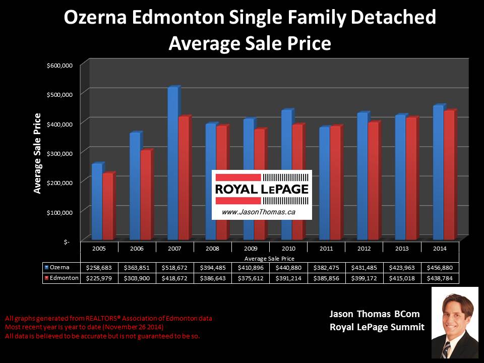 For all active listings in this area, visit Ozerna homes for sale  So far in 2014, the average selling price for a single family detached house in Ozerna (also known as Cherry Grove) has reached $456,880.  The average days to sell a home in Ozerna in 2014 has been 48 days.  For more detailed sale price stats and price graphs on Ozerna visit Ozerna homes for sale in Edmonton