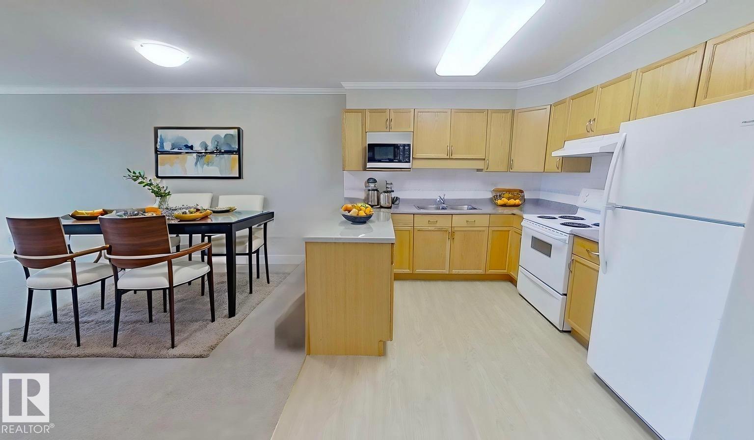 Welcome to this bright and updated 1-bedroom, 1-bathroom condo offering 663 sq. ft. of comfortable living space in a 55+ adult building. The home features brand new carpets, fresh paint, and laminate flooring throughout. The functional layout includes a spacious in-suite laundry room, a kitchen with built-in dishwasher, and a living room with corner gas fireplace and tiled surround. Large south-facing windows provide plenty of natural light and access to a private balcony. This well-maintained building includes an elevator, social room with kitchen, and heated underground parking with personal storage cage. Condo fees cover heat, water, building insurance for common areas, and exterior maintenance. Conveniently located directly across from Bonnie Doon Shopping Centre, with easy access to bus routes, the new LRT line, Bonnie Doon Leisure Centre, and Idylwylde Public Library.