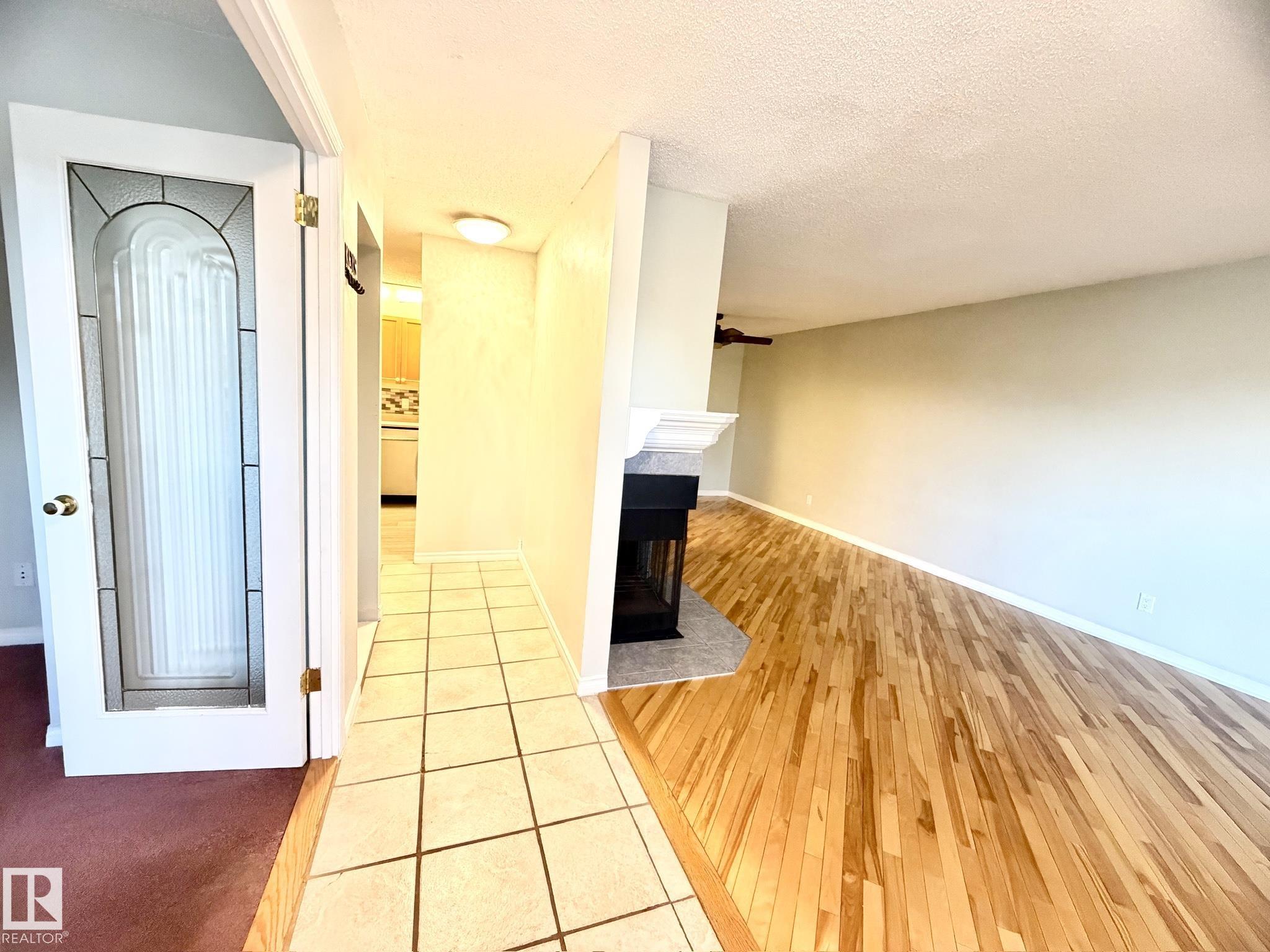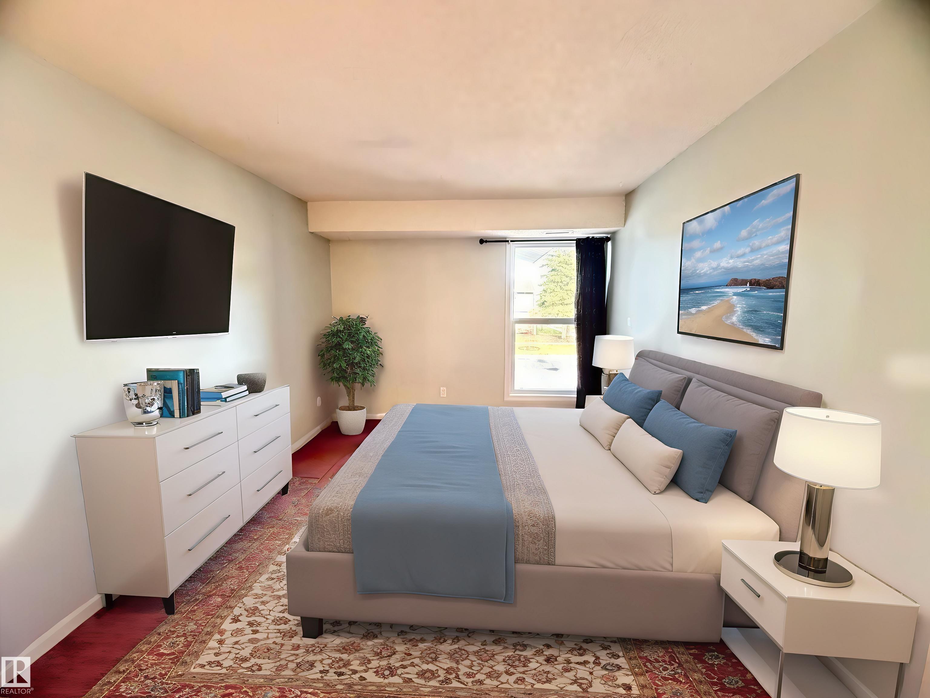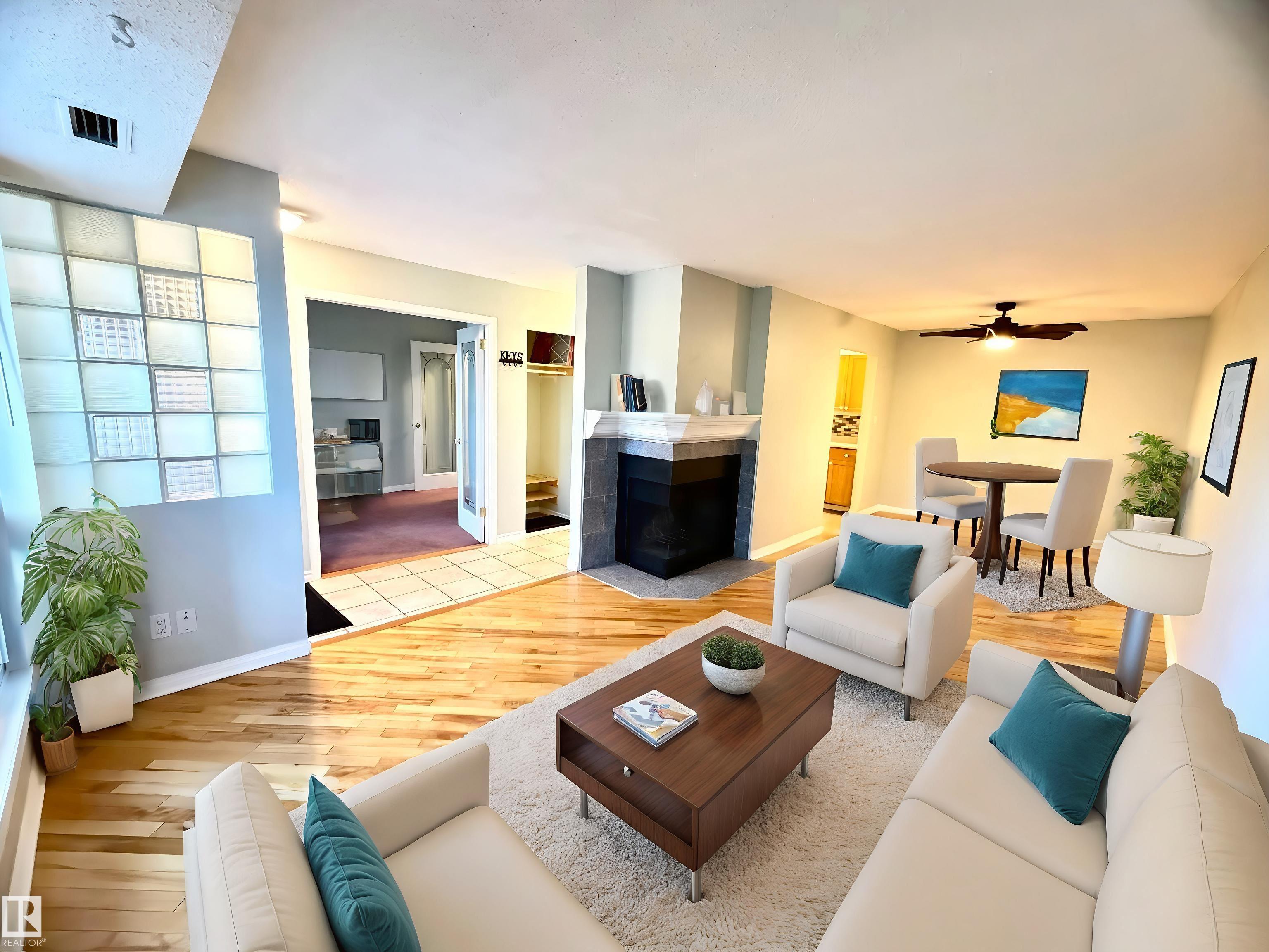 Welcome to this bright & beautifully maintained 2-bedroom carriage-style condo in the desirable community of Skyrattler! Close to parks, schools and the LRT system! Perfectly located in Hunter?s Run, this TOP FLOOR, west-facing unit offers peace, privacy, and loads of natural light. The spacious living and dining areas feature gleaming hardwood floors and a cozy tiled-surround wood fireplace, while the modern kitchen shines with maple cabinets, subway tile backsplash, and new vinyl plank flooring. The massive walk-in pantry adds incredible storage! The large primary bedroom includes a walk-through double closet with wardrobes and private access to the updated 4-piece bath. The second bedroom?with elegant French doors?offers flexibility as a guest room, home office, or studio. Enjoy your private balcony surrounded by mature trees, complete with a huge outdoor storage area. With in-suite laundry, a newer high efficiency furnace, assigned parking, and a pet-friendly policy, this condo is the total package!