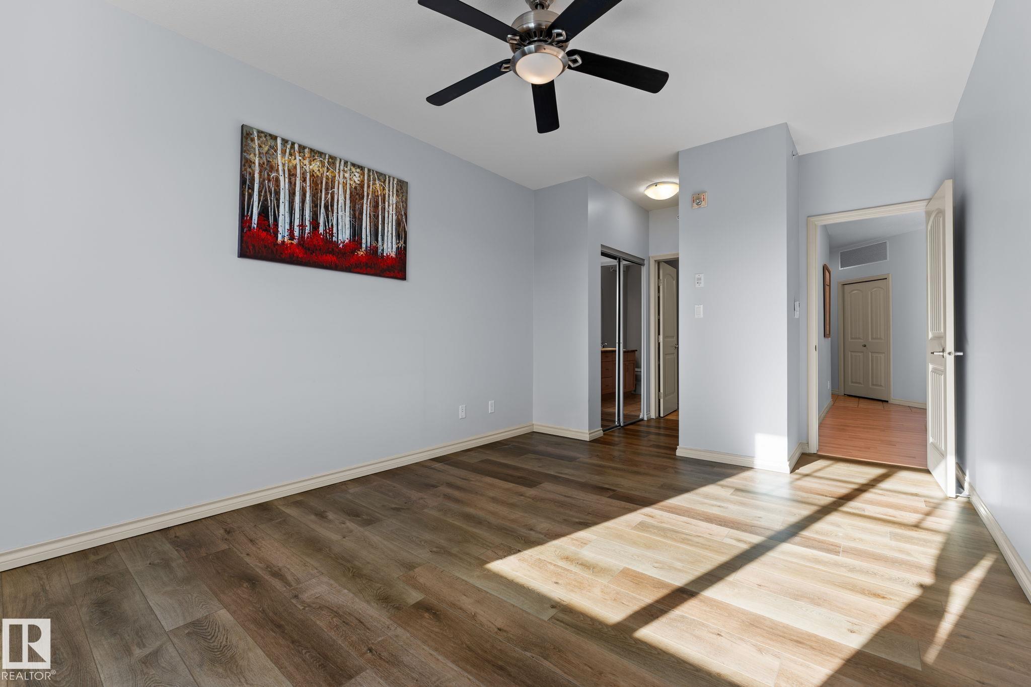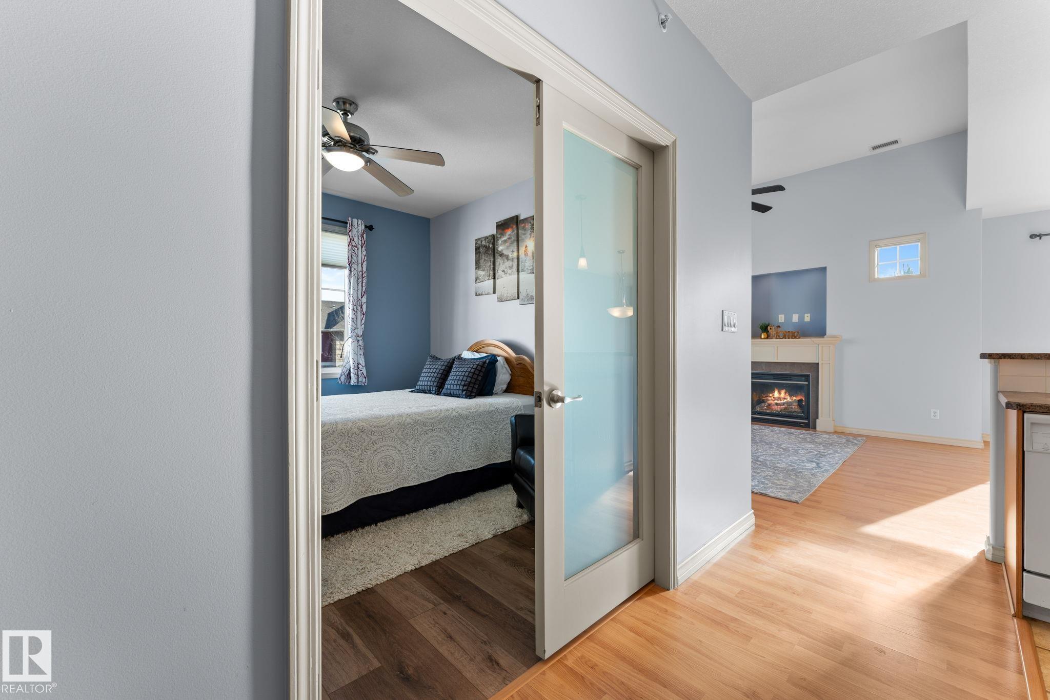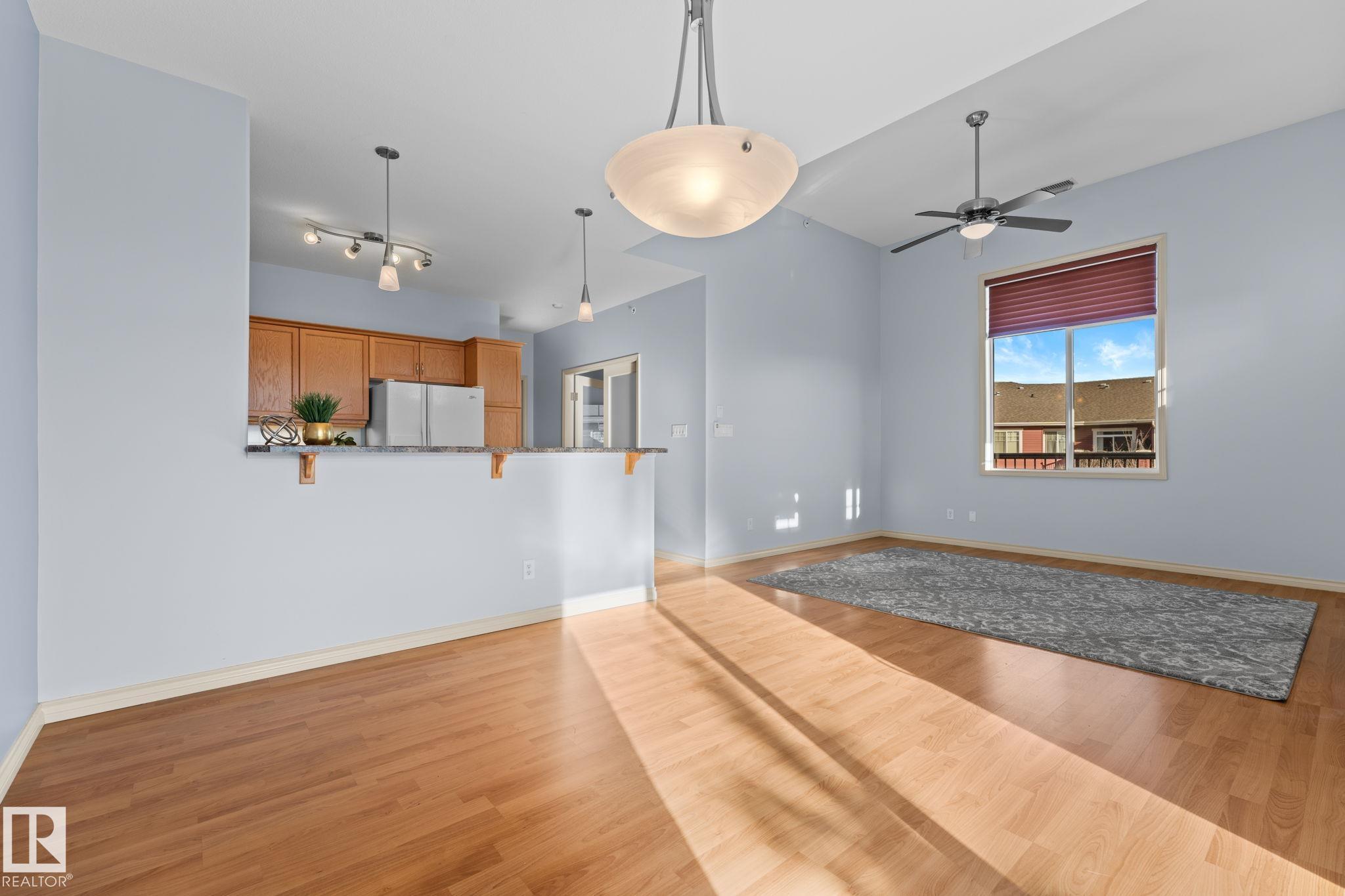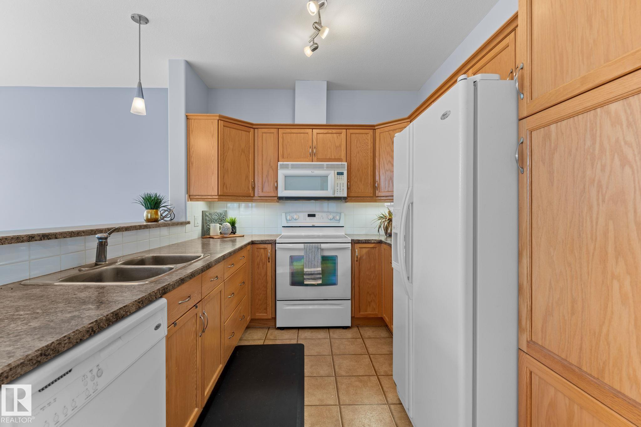 Rare offering, 3 bedroom, 2 bath top-floor corner unit w/ massive wrap-around southeast balcony. Extra large unit at over 1300 sq ft, vaulted 12-ft ceilings, a bright open-concept layout. The spacious primary suite is privately located away from the other bedrooms, easily fits a king bed, and includes dual walk-through closets and a 4-piece ensuite with double sinks and a walk-in shower. This immaculate unit offers newer flooring (no carpet), A/C, gas fireplace, gas BBQ hookup. The kitchen, dining, and living areas flow seamlessly, creating an airy, light-filled space perfect for entertaining. Large laundry room w/ extra storage, 2 titled heated underground parking stalls (one beside the elevator and one beside the stairwell), and storage locker. Condo fees incl. heat, water, and sewer. Pet-friendly building offers premium amenities: fitness room, theatre, games lounge, guest suite, and car wash bay Situated, within minutes of major shopping, dining, and quick access to the Anthony Henday.