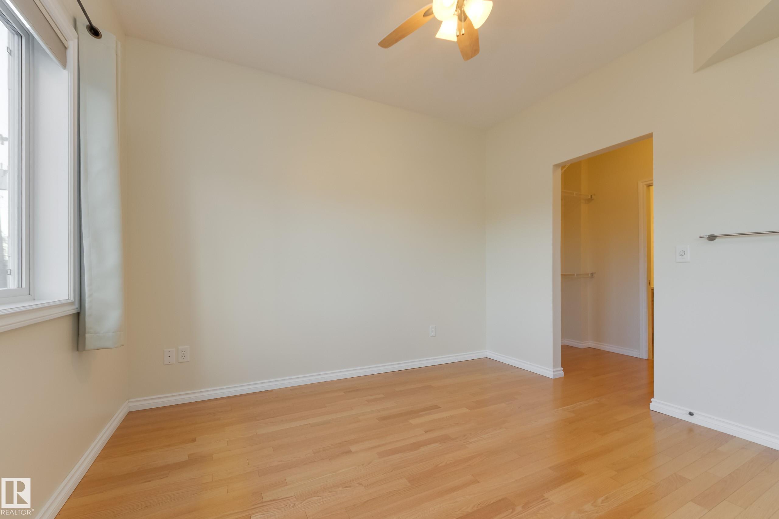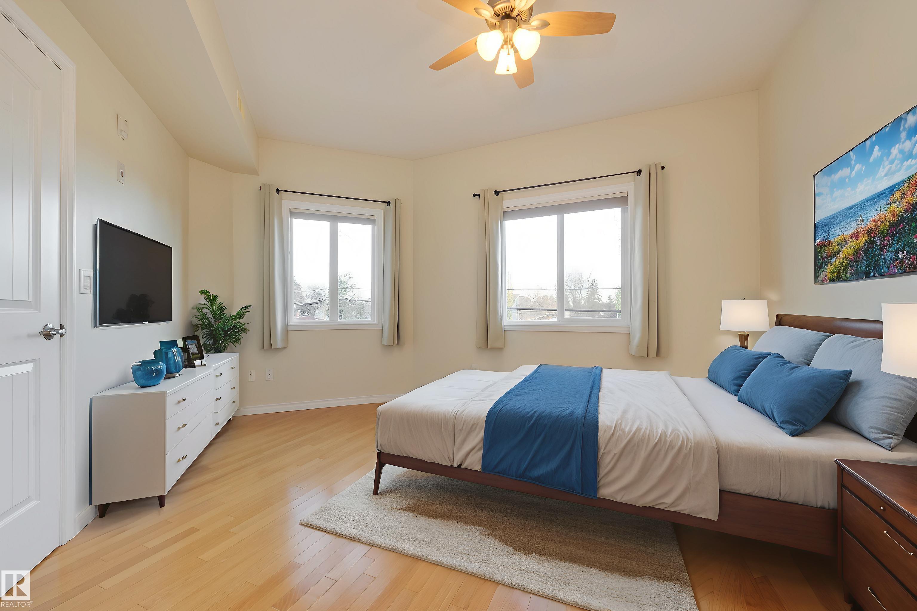 CORNER END UNIT! This gem has 2 beds, 2 baths, AIR CONDITIONING, 9-ft ceilings, GLEAMING HARDWOOD & upgrades throughout. Extremely well maintained by original owners. Freshly painted; move-in ready! The kitchen and living spaces are open concept. Loads of windows, natural light, and a cozy gas fireplace. The large west-facing balcony is your outdoor oasis and features a natural gas hook-up for the BBQ. The ultra-quiet & spacious primary suite has a walk-through closet that leads to your well equipped 3-pc ensuite bath. Another bed & bath are on the other side of the unit; minimal sound transfer! IN-SUITE LAUNDRY (machines less than 2 yrs old) and ample storage. You also have an assigned UNDERGROUND PARKING STALL to keep your vehicle warm all winter, along with a storage cage for your seasonal items. Belcanto Court is a 45+ building that has a real sense of community and fantastic amenities including a car wash in the heated parkade, a social room, and a guest suite. Bonnie Doon Mall & transit steps away!