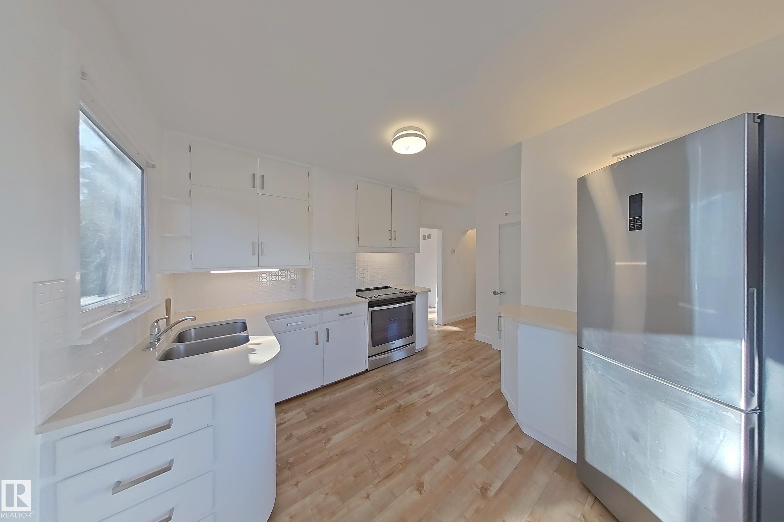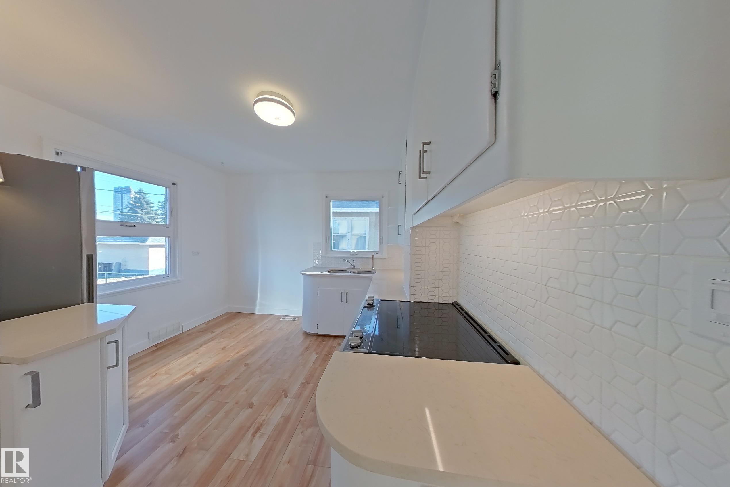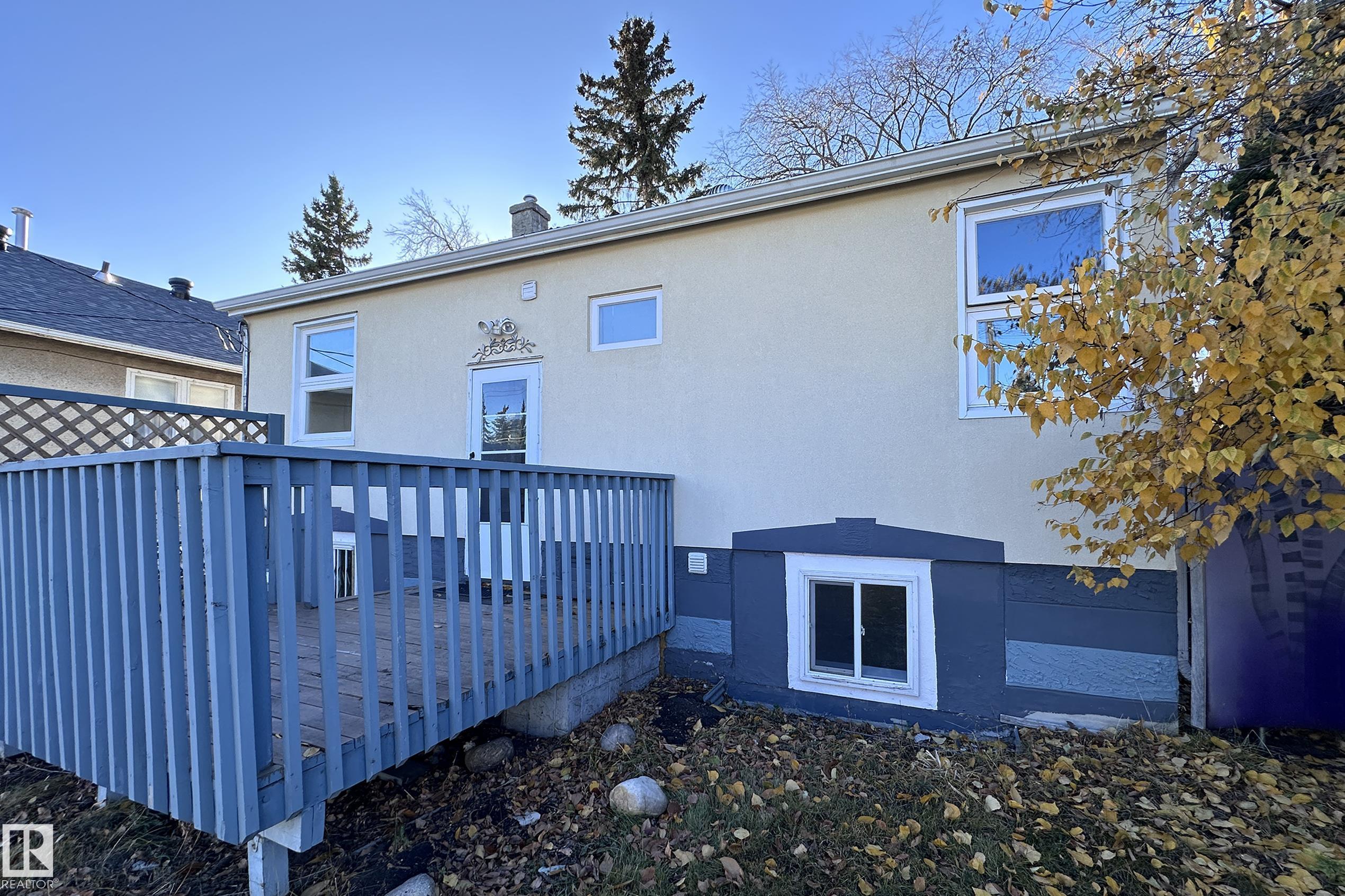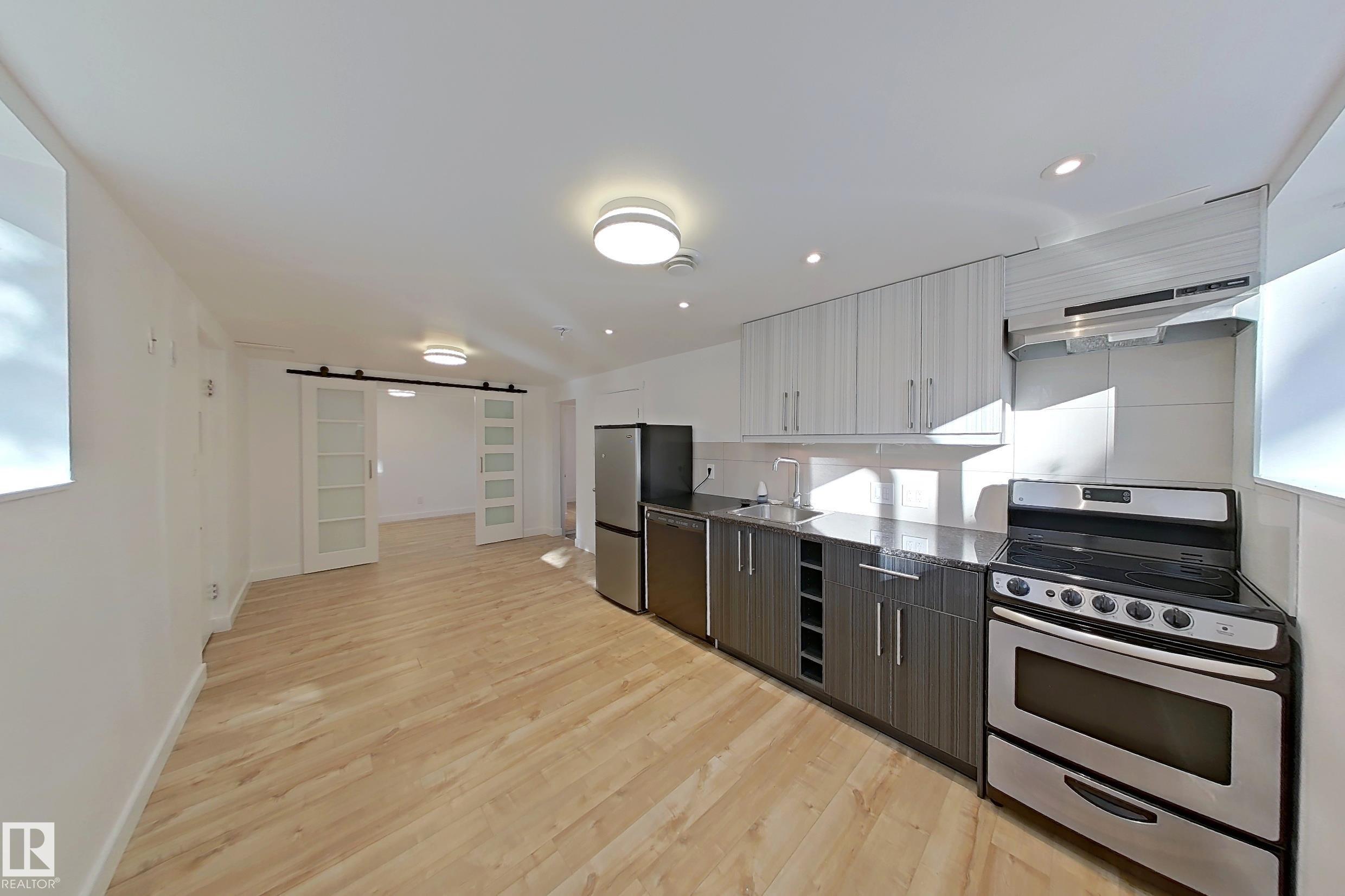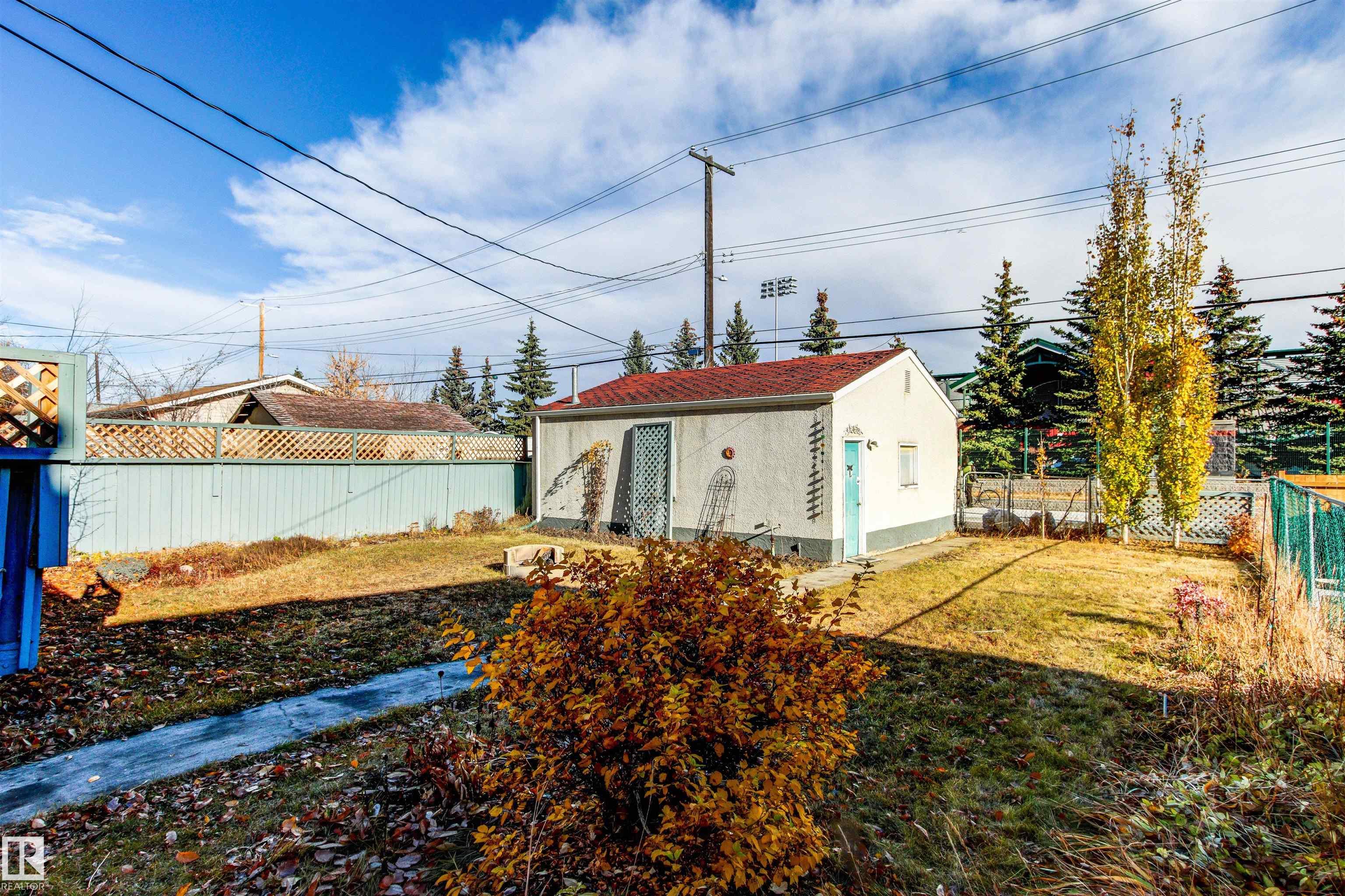 Charming, midcentury bungalow in Mccauley neighbourhood, walking distance to the LRT, rec centre, cafes, parks and quaint businesses. Bright and inviting, renovated with plenty of natural light. This property offers 3 bedrooms, a den, 2 full bathrooms, 2 kitchens and lots of storage space. Main level has living room with south and west windows and coved ceiling. Kitchen on main floor comes with quartz countertops as well as upgraded fridge and stove. Bright basement was renovated few years ago, has large windows, a second kitchen with living area, bathroom with walk-in shower, bedroom, den and utility/laundry room. Windows were upgraded as well. Three large windows fully swing open for easy furniture move. HWT replaced within the last year. There is also newer furnace installed in 2017, and newer stucco. Lot is 45' by 120' (5,490 sq.ft.) This property is fenced with a big lawn, established perennials and fruit tree, and a double detached garage. 2 photos were virtually furnished. Make a move!