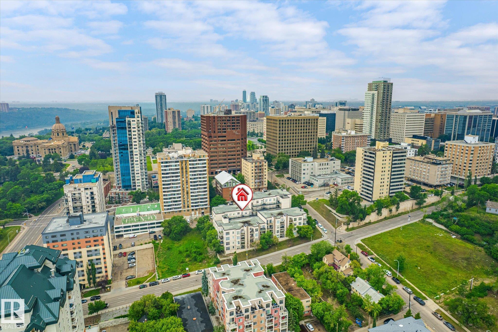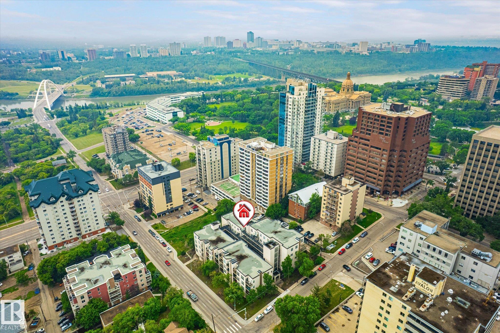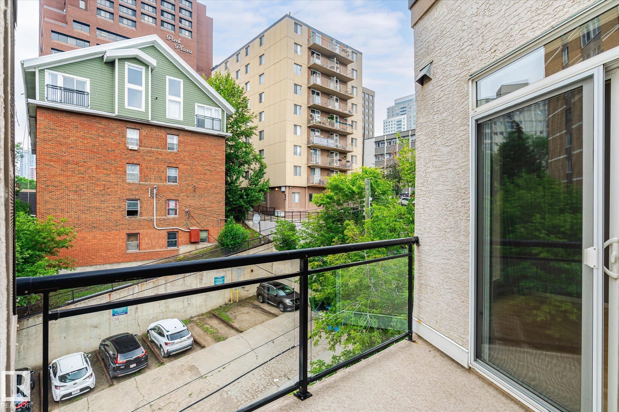 Looking for a top floor river valley unit? This contemporary condo is in a fantastic location, steps away from the Legislature, the river valley and the baseball park! As you walk to the suite's front door you will notice that your front entry and 2nd bedroom overlooks the river valley. Inside 9ft ceilings with floor to ceiling windows allows the sunlight in to bounce off of your hardwood flooring. A maple island kitchen with eating bar and tons of counters and cabinets is perfect for the chef in the family and it is also nicely equipped with stainless steel appliances. Patio doors lead to a balcony that faces west, A/C will keep you cool. The large master bedroom has a walk in closet and a full ensuite with tile tub surround and tile flooring. Main bathroom with tile flooring and shower, stackable washer and dryer and secure underground parking stall round out the features. There is ample visitor parking in the alley on the west side of the building.