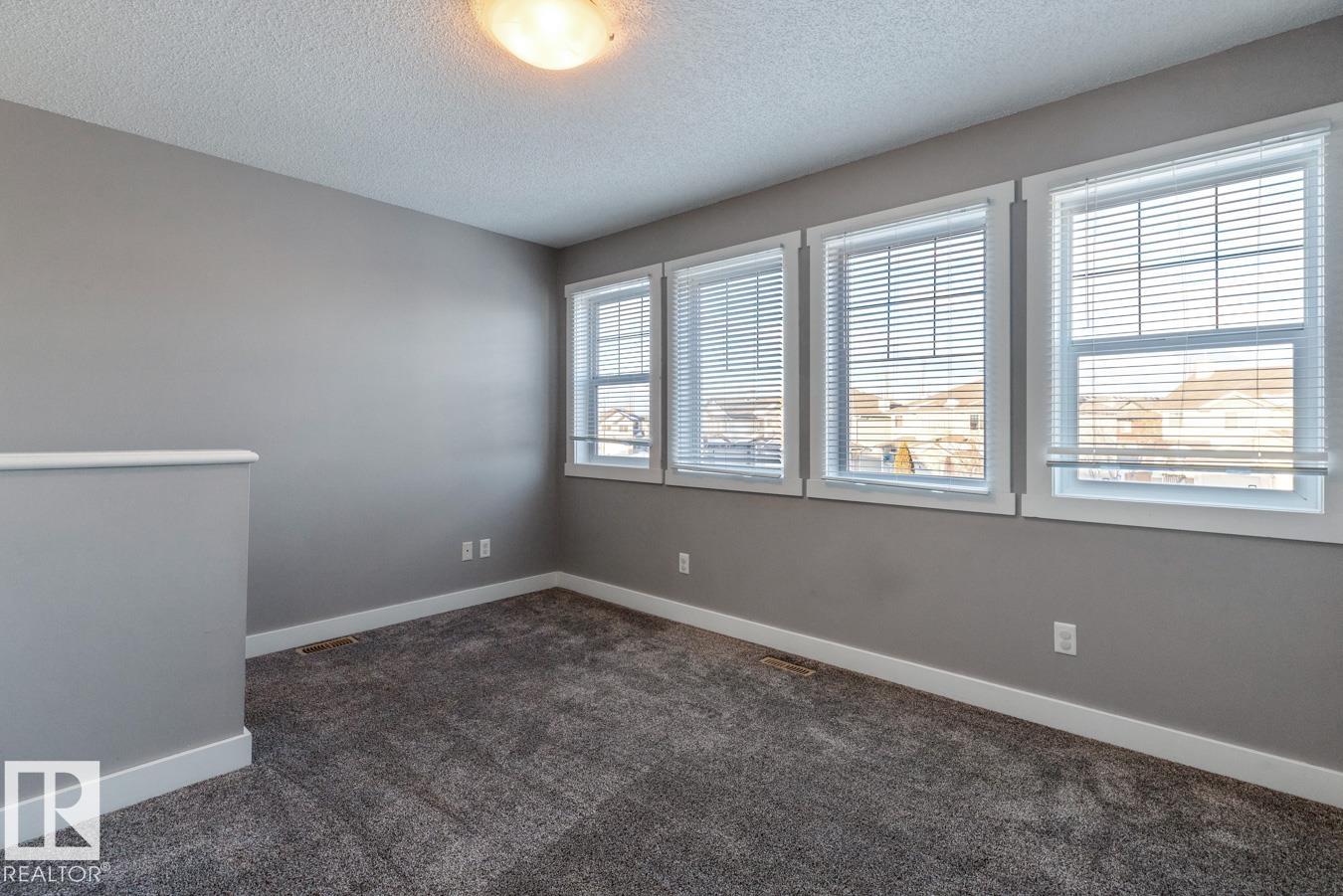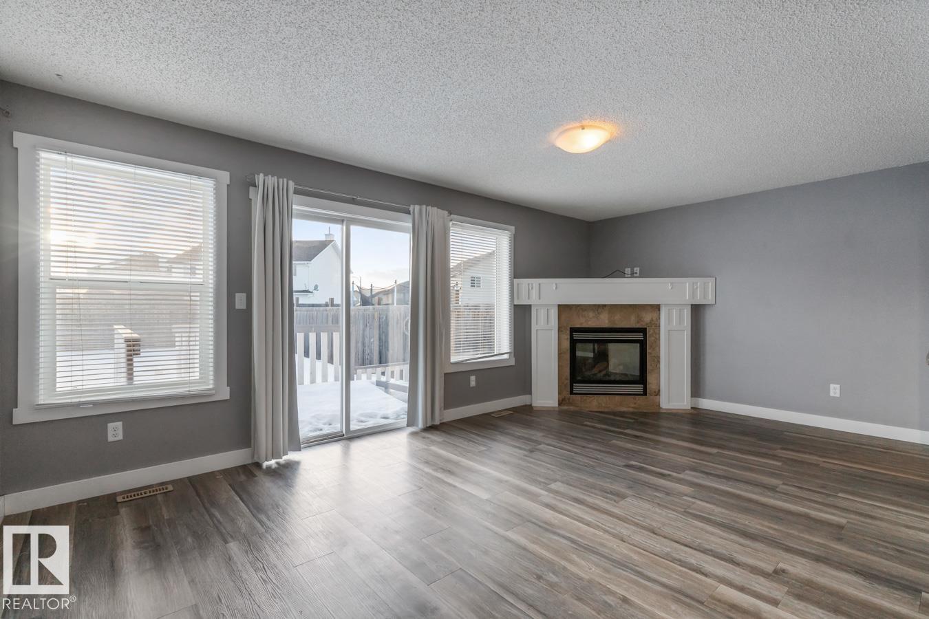 Tucked away on a quiet cul-de-sac in Tamarack, this beautifully maintained half duplex sits on a large 527.80 mē pie-shaped lot and offers 3 bedrooms & 2.5 baths, perfect for families or first-time buyers. A spacious entry welcomes you with vinyl plank flooring that flows into the bright great room. The kitchen features ample cabinetry, a corner pantry, and an island overlooking the living room with cozy fireplace and patio doors leading to the deck, ideal for everyday living and entertaining. New carpet leads upstairs to a sun-filled bonus room, along with a king-sized primary suite offering a walk-in closet and ensuite. Two additional generous bedrooms and a 4pc bath complete the upper level. The unfinished basement provides excellent potential for future development. NEW hot water tank. Enjoy the massive yard and the convenience of being just minutes from parks, trails, schools, and all amenities, this is a fantastic place to call home!