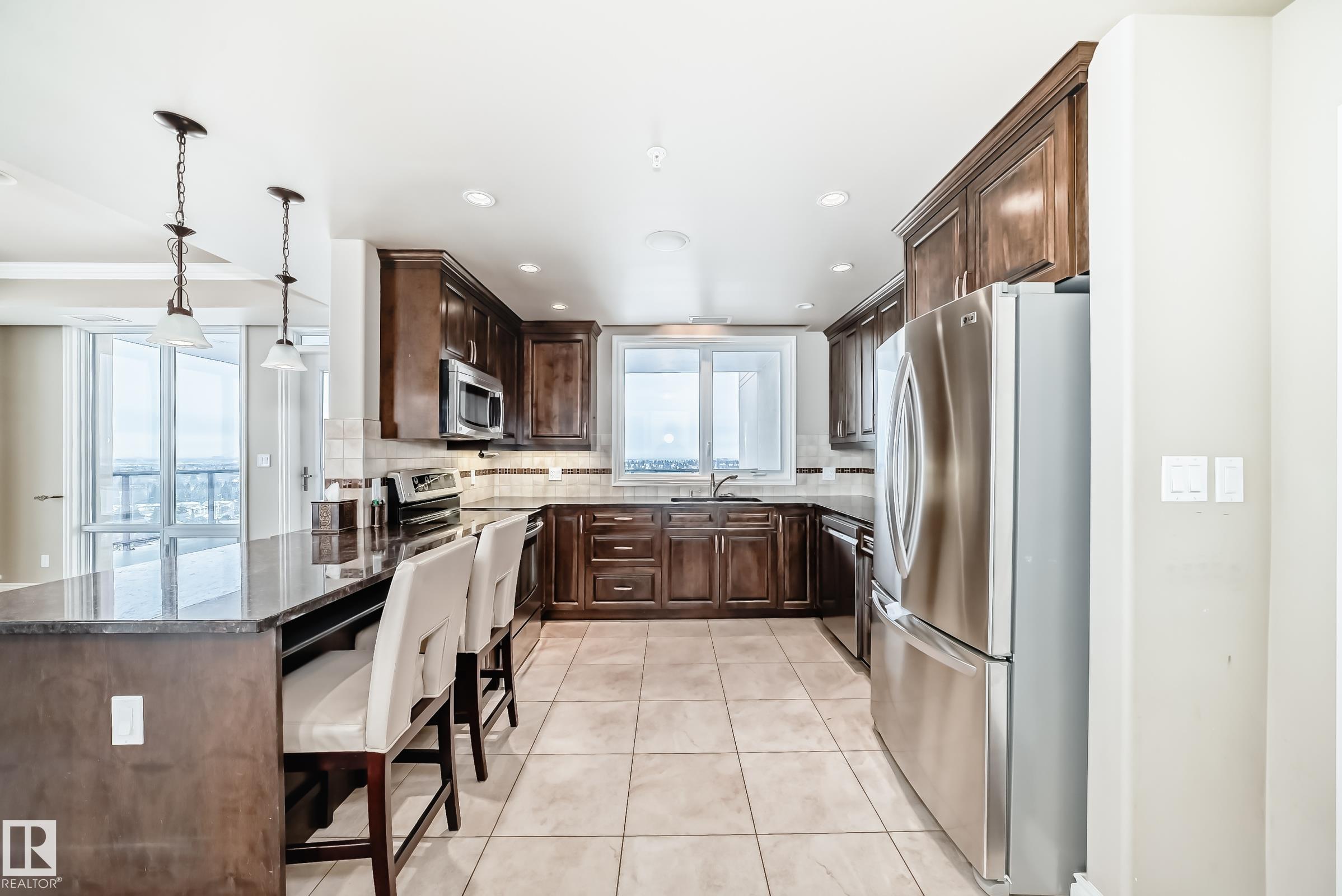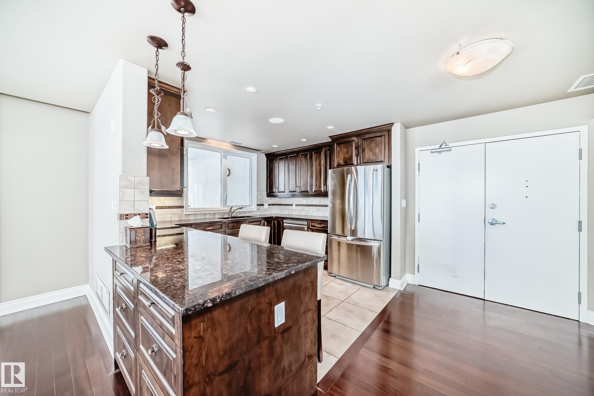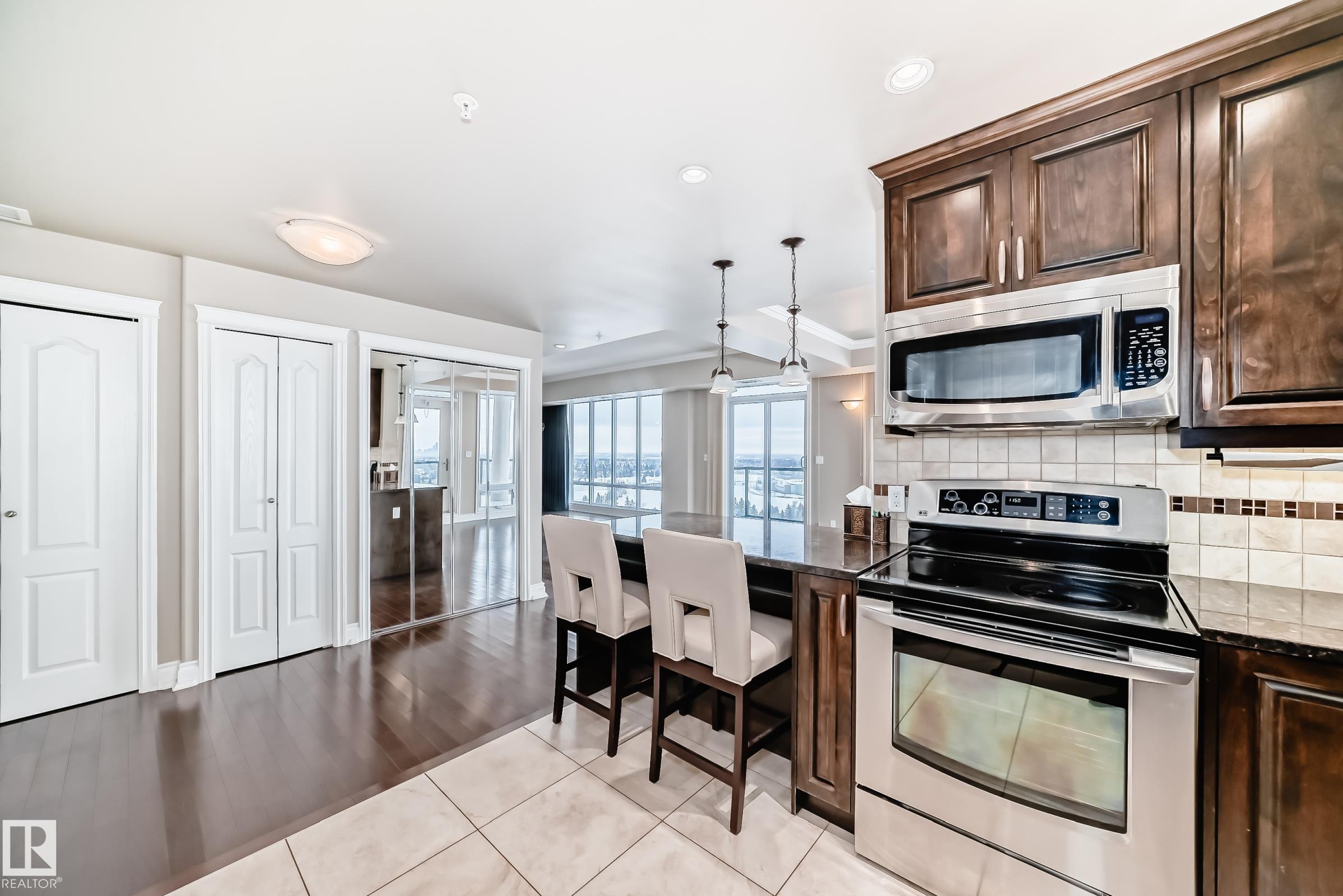 Welcome to this impressive 55+ PENTHOUSE! Over 1,850 sq ft of beautifully designed living space. Featuring 2 spacious bedrooms plus a versatile den, the functional layout is filled with natural light from floor-to-ceiling windows. The stunning kitchen boasts granite countertops, SS appliances, and an abundance of cupboards. Enjoy the expansive living room with a cozy fireplace, perfect for relaxing or entertaining. Step outside to two massive balconies showcasing incredible views. The home includes a glamorous 5-piece bathroom, an additional 3-piece bath, and a large laundry room with sink, extra cabinetry, and storage. Condo fees include ALL utilities (even electricity) and basic cable. Comes with a titled underground parking stall. This adult community is connected to Shepherd?s Care Facility, offering access to full care services if needed. Amenities include a full-service dining room (in-suite delivery available for a fee), guest suite, 4th floor patio & garden, chapel, and social room. Welcome home!!