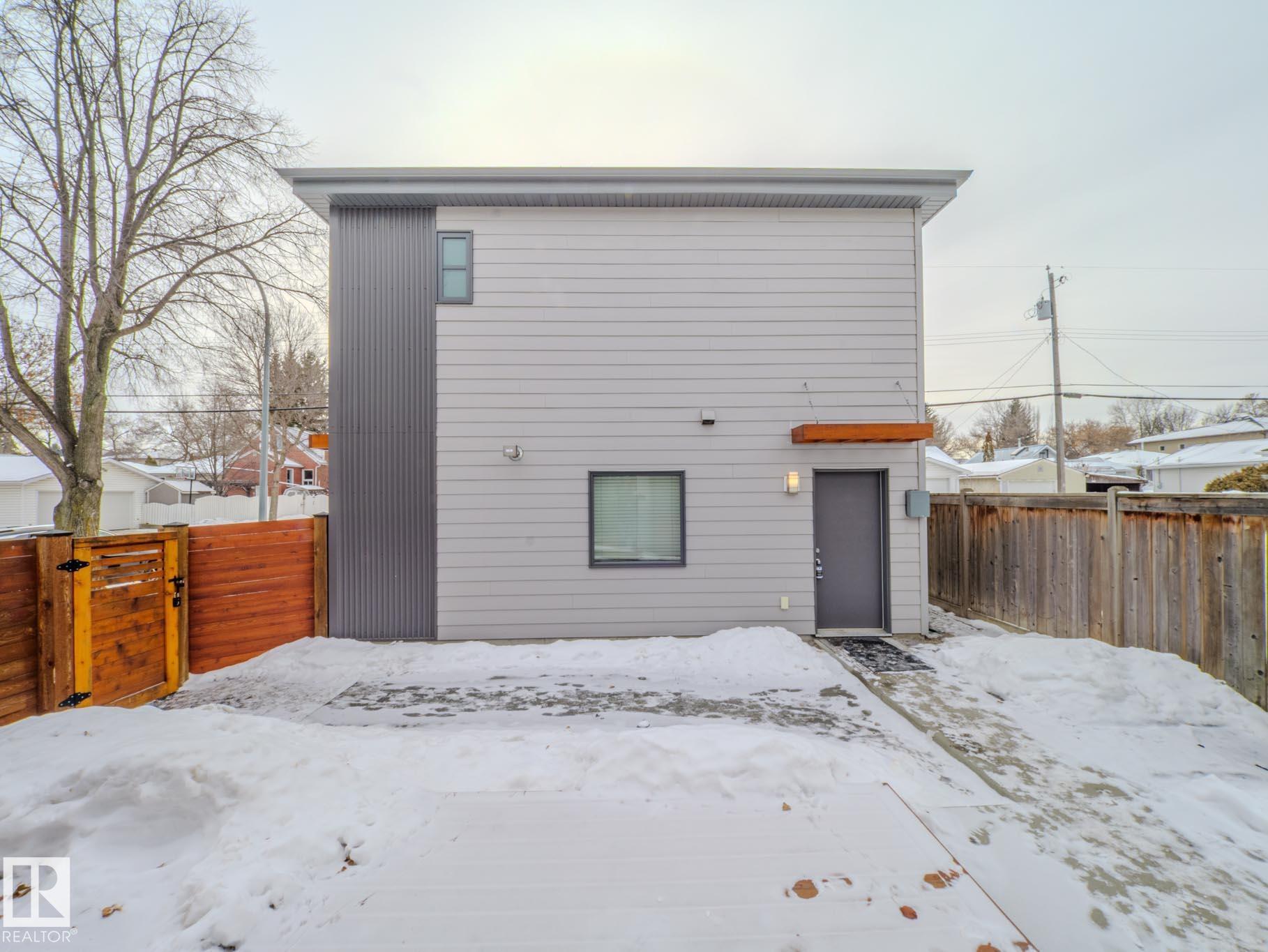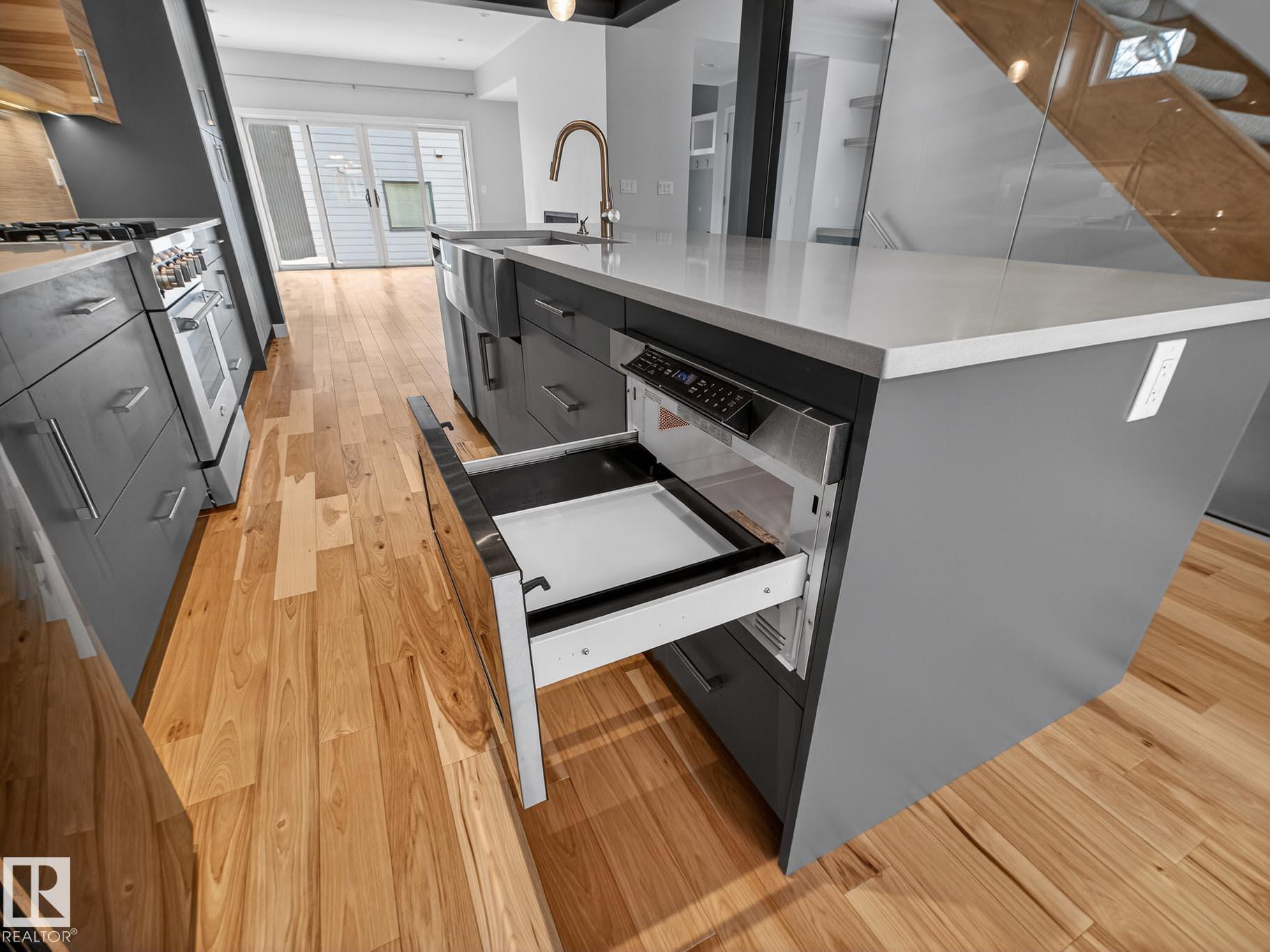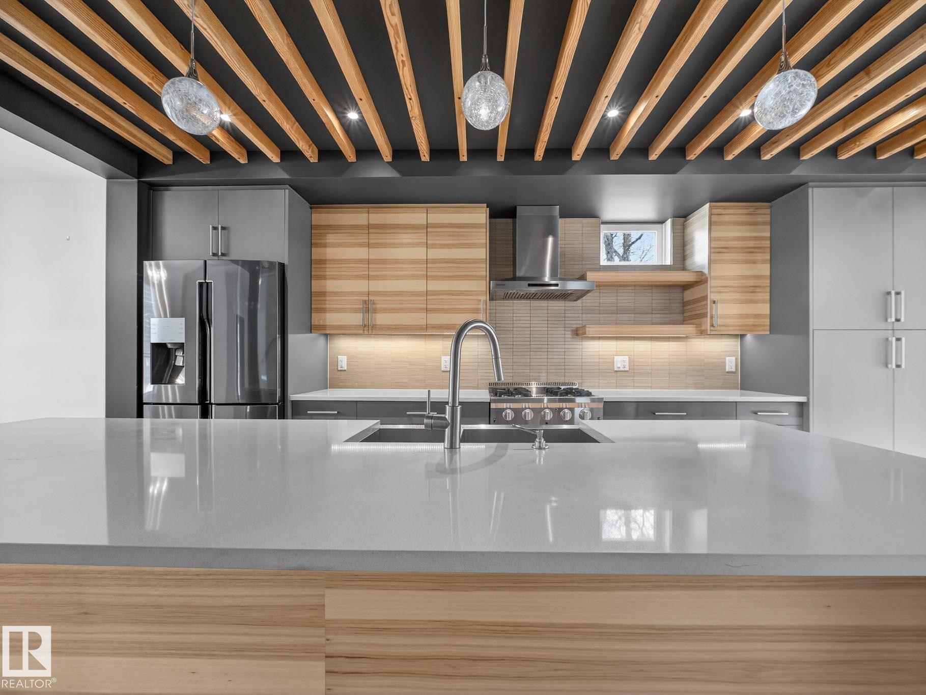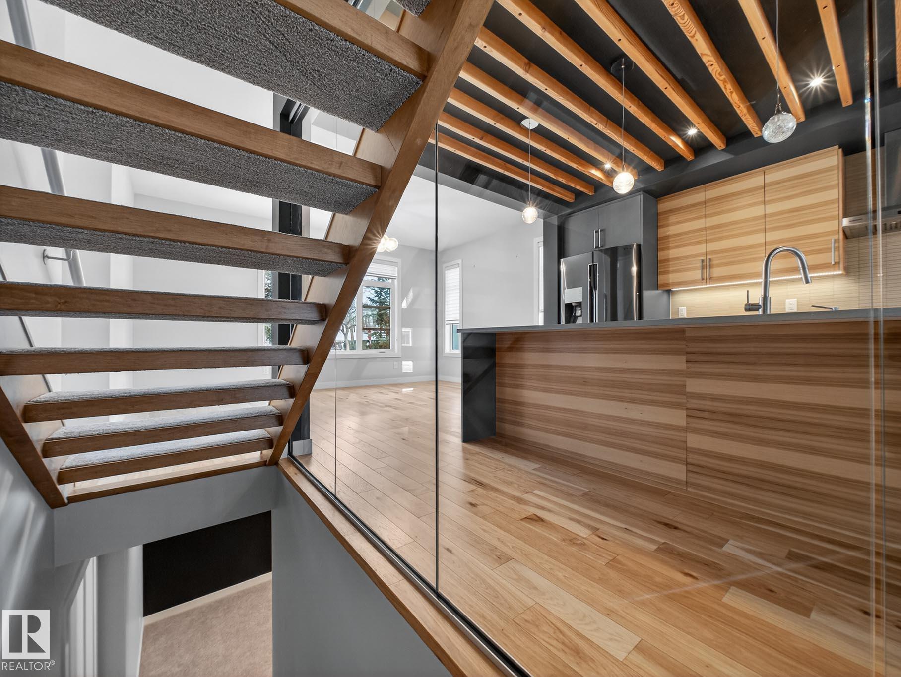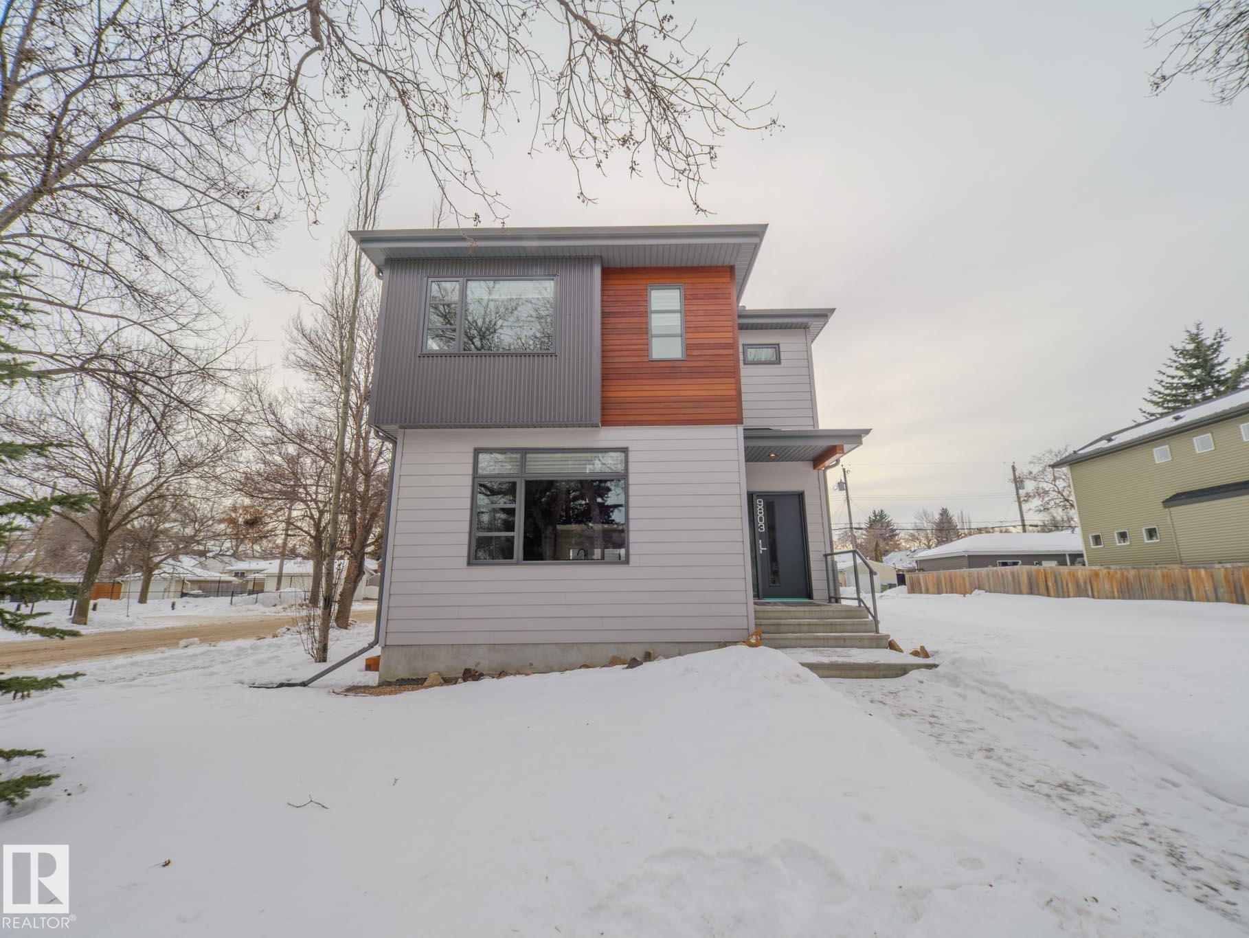 Homes By Metro combined modern elegance with sophisticated living when they designed this meticulous 4-bedroom, 4-bathroom home plus a legal GARAGE SUITE. The stunning kitchen features a linear wood ceiling, enormous quartz island, top of the line appliances, including a gas stove, & ample cabinetry. Warm hickory flooring enchances the seamless open concept layout where you transition effortlessly through huge sliding glass doors to a private, south facing sunny backyard, complete with an oversized deck. Flush mount gas fireplace & custom shelving in the living room. Upstairs is the luxurious primary retreat with massive walk-in closet & 4-piece ensuite. Completing this level are two great size bedrooms, both with walk-in closets, a 4-piece bathroom & a large laundry room. The fully finished basement has a family room, fourth bedroom with b/i desk & 4-piece bathroom. The one bedroom garage suite has a street facing entrance & laundry. A/C. Heated double detached garage. 20 min walk to Mill Creek Ravine.