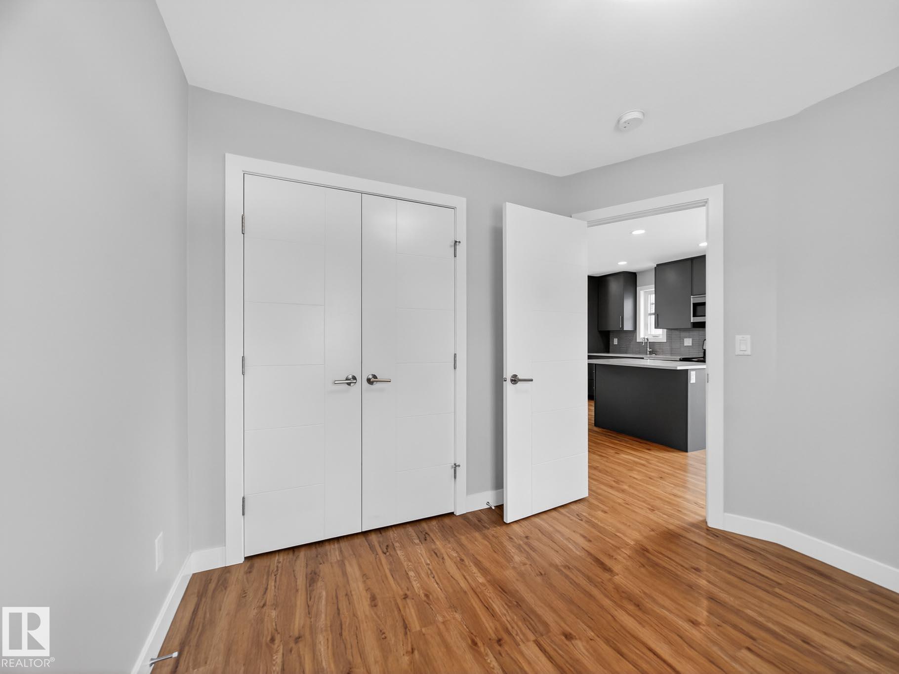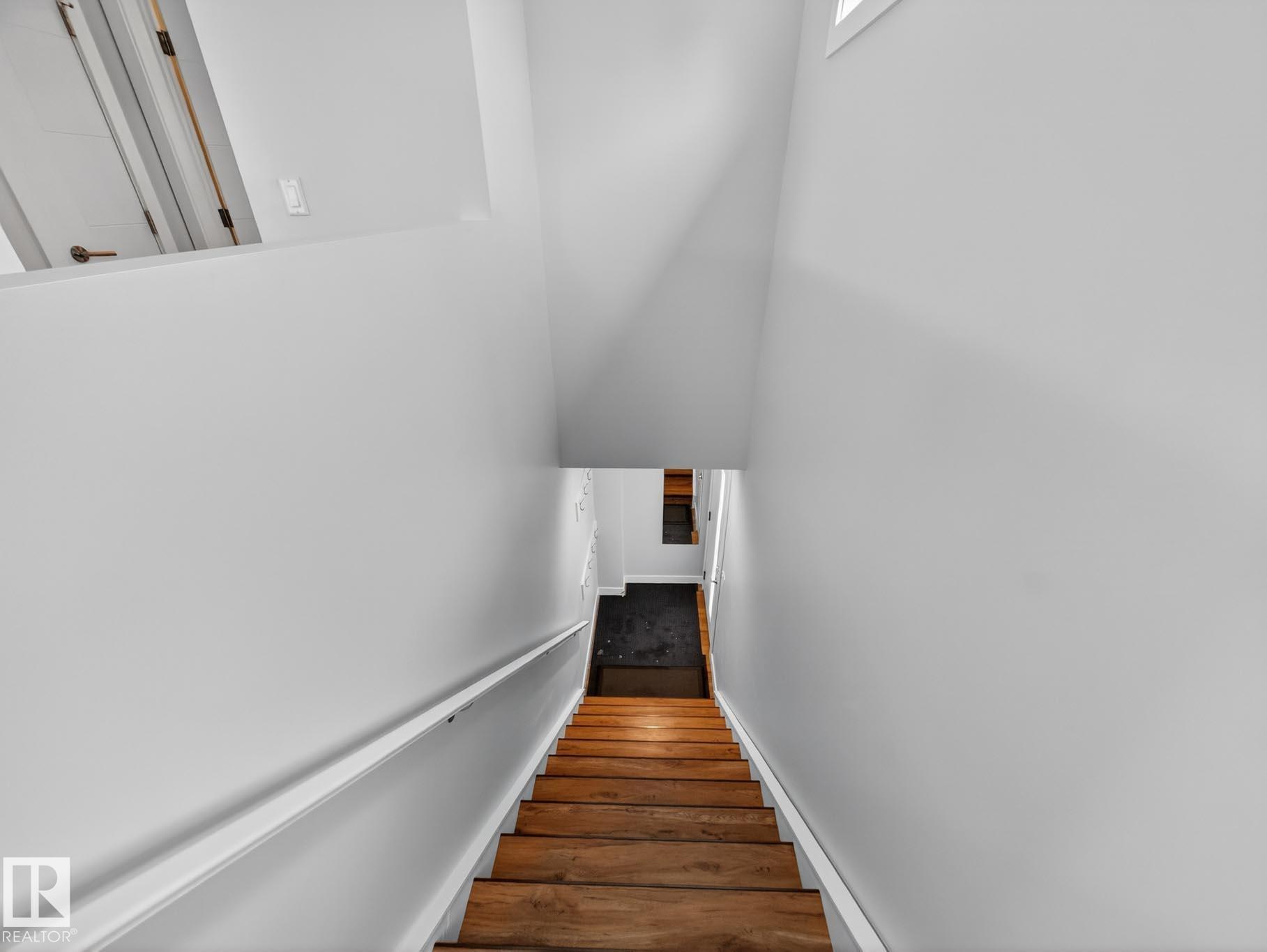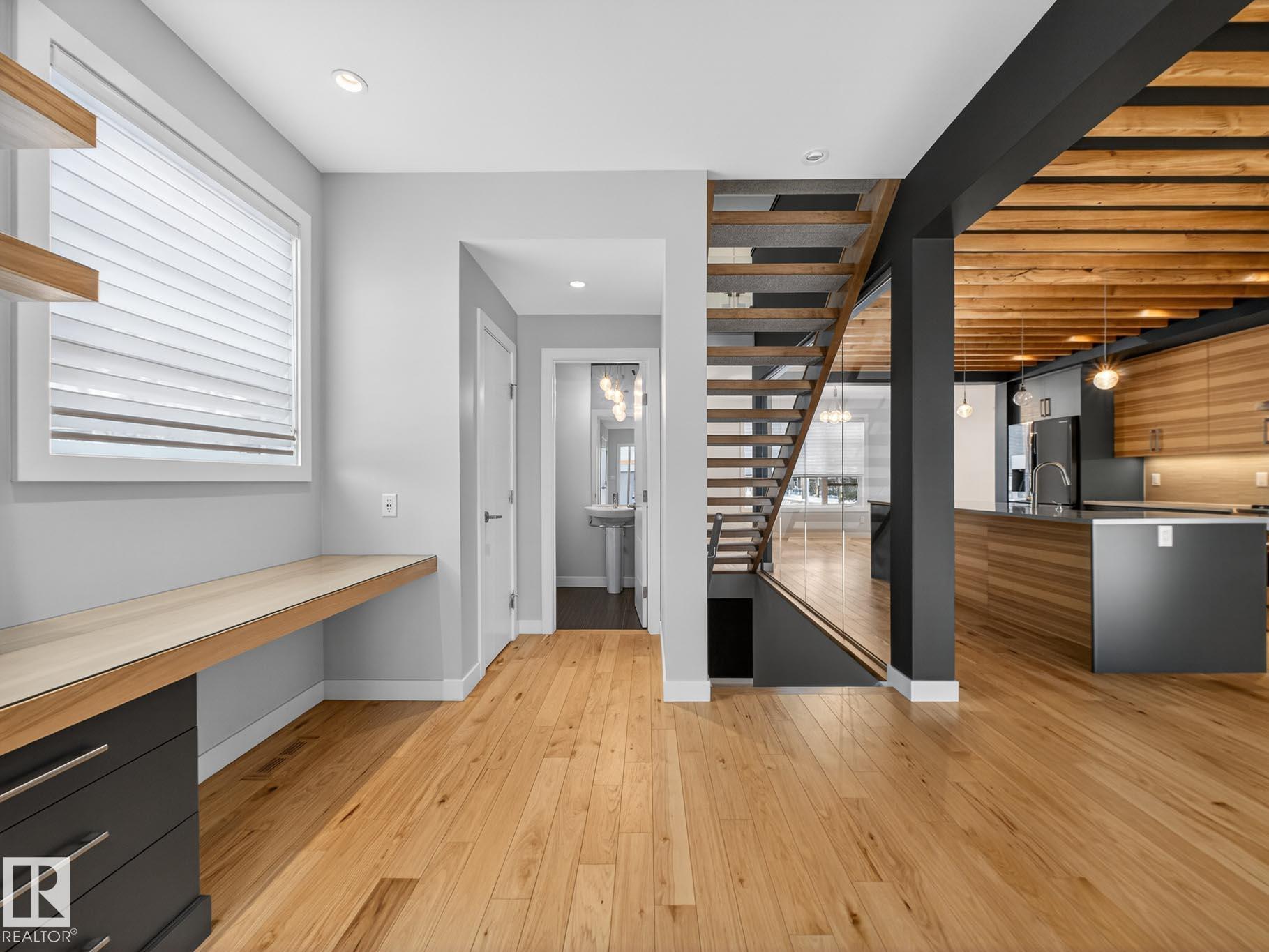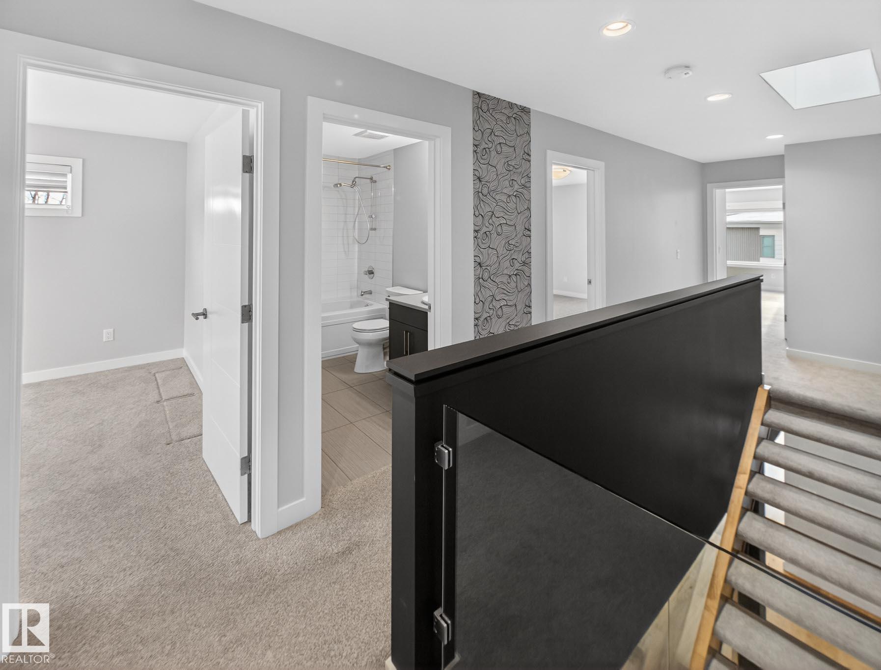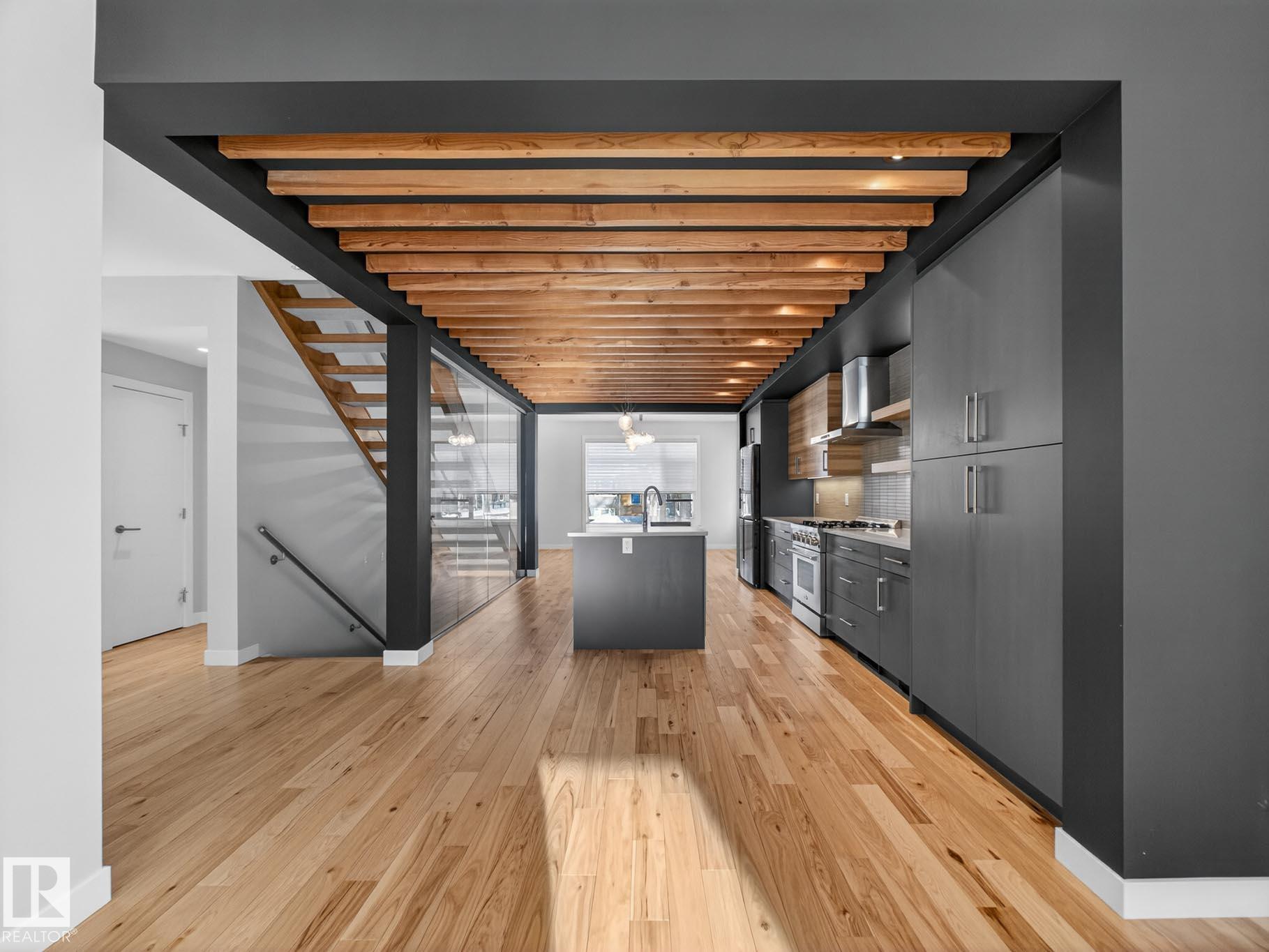 Homes By Metro combined modern elegance with sophisticated living when they designed this meticulous 4-bedroom, 4-bathroom home plus a legal GARAGE SUITE. The stunning kitchen features a linear wood ceiling, enormous quartz island, top of the line appliances, including a gas stove, & ample cabinetry. Warm hickory flooring enchances the seamless open concept layout where you transition effortlessly through huge sliding glass doors to a private, south facing sunny backyard, complete with an oversized deck. Flush mount gas fireplace & custom shelving in the living room. Upstairs is the luxurious primary retreat with massive walk-in closet & 4-piece ensuite. Completing this level are two great size bedrooms, both with walk-in closets, a 4-piece bathroom & a large laundry room. The fully finished basement has a family room, fourth bedroom with b/i desk & 4-piece bathroom. The one bedroom garage suite has a street facing entrance & laundry. A/C. Heated double detached garage. 20 min walk to Mill Creek Ravine.