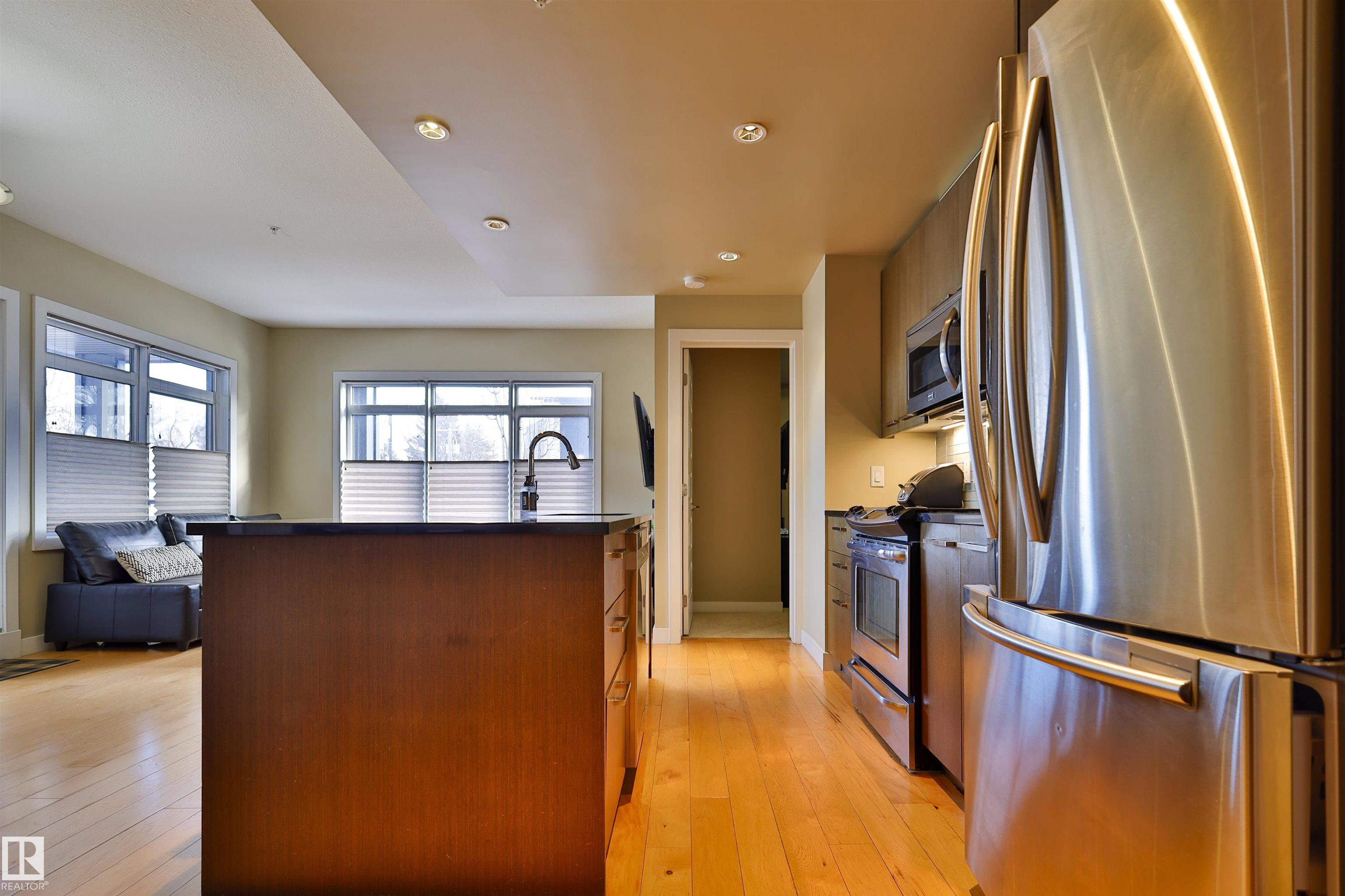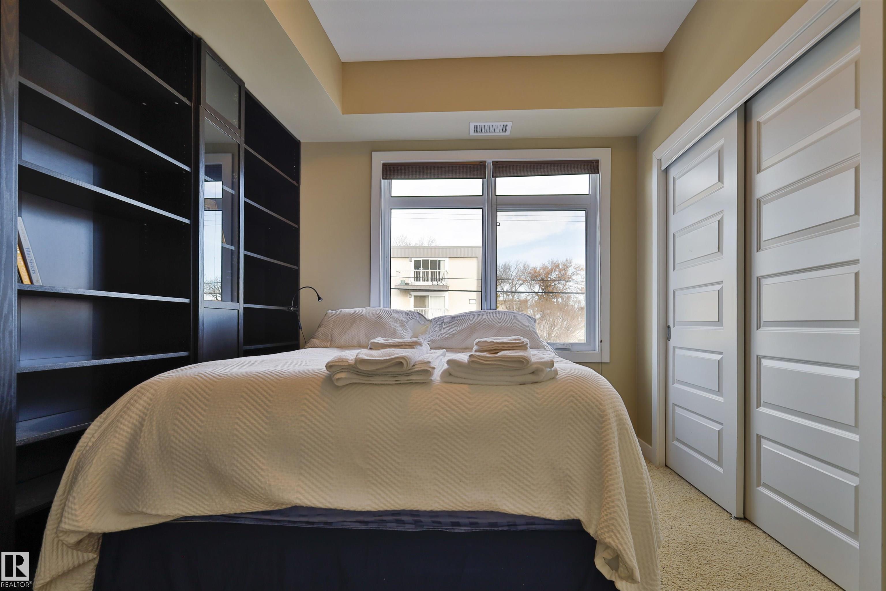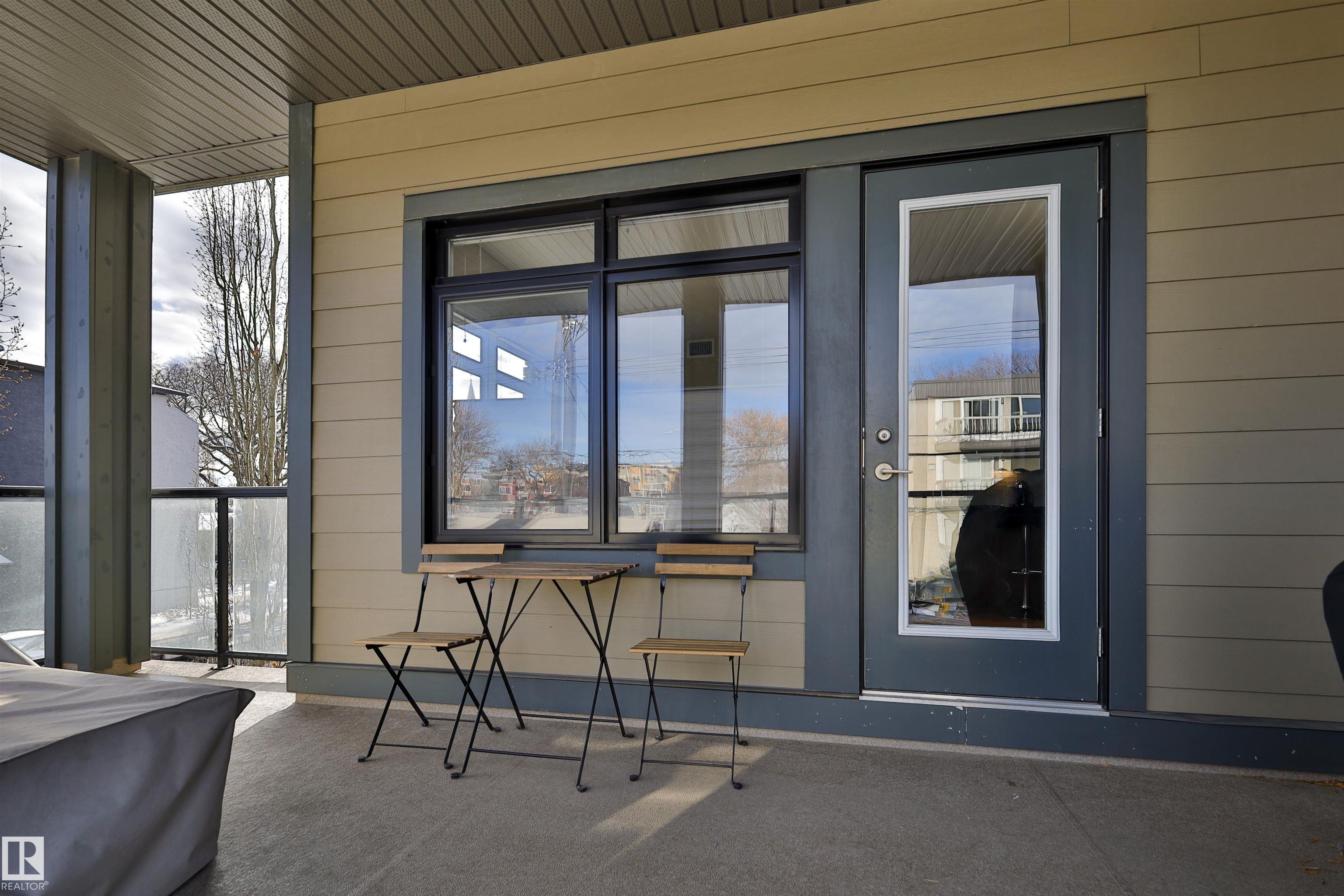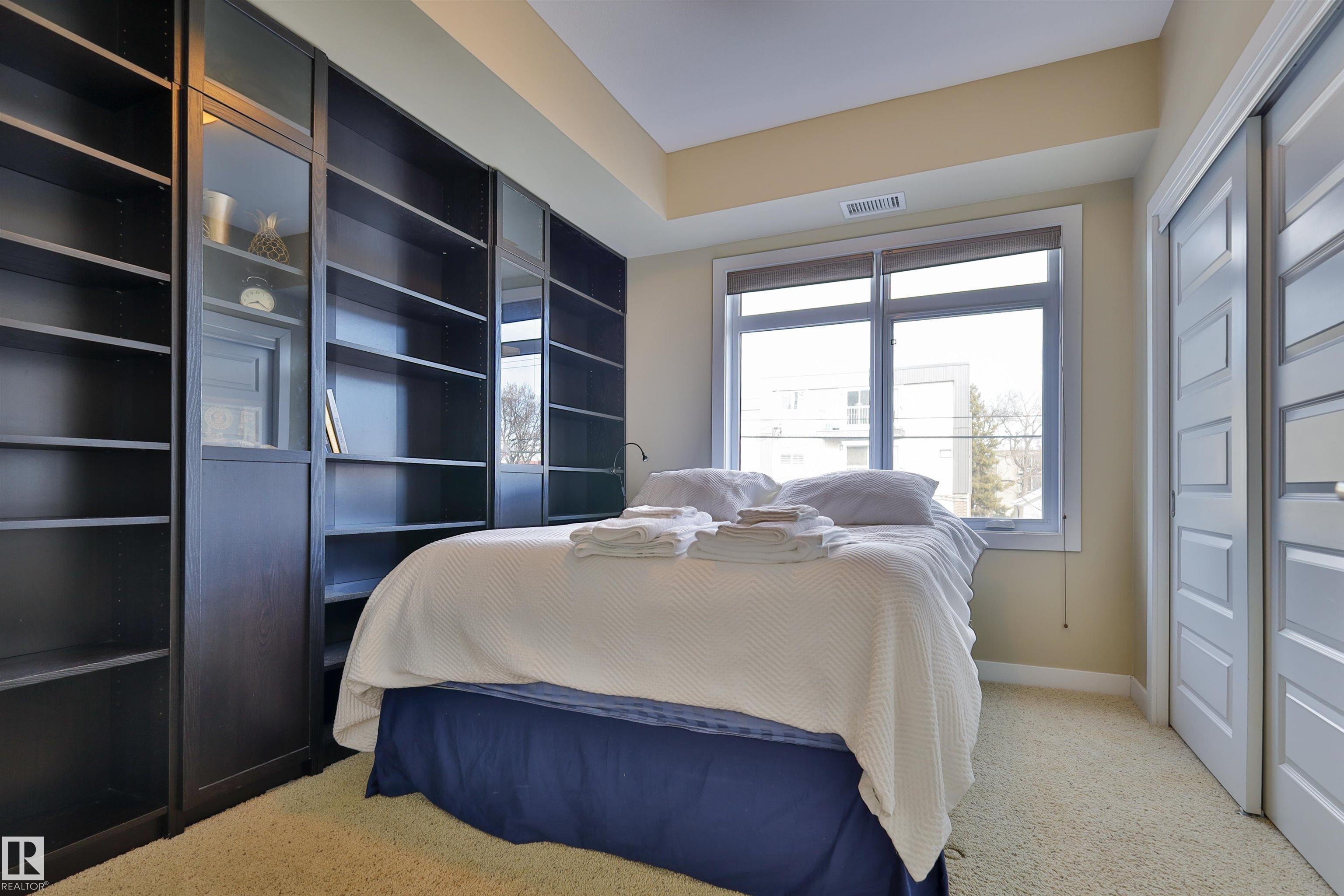 This beautifully designed condo is perfectly situated just off Whyte Ave, placing you minutes from the U of A, River Valley trails, top restaurants, shopping, and everyday essentials. Offering 857 sq. ft. of contemporary living space, this urban home features two bedrooms and two full bathrooms with a thoughtfully designed open-concept layout. Large windows fill the living area with natural light, creating a bright and welcoming atmosphere. The sleek kitchen is equipped with stainless steel appliances, ample cabinetry, and a large island with bar seating?ideal for hosting or casual weeknight dinners?while flowing effortlessly into the dining and living spaces. The primary bedroom includes a walk-through closet with built-in organizers and a private four-piece ensuite. A second bedroom with built-in shelving offers flexibility for a home office or guest room. With in-suite laundry, and a generous private balcony with BBQ hookup, heated underground parking, unbeatable location, for urban style & comfort.
