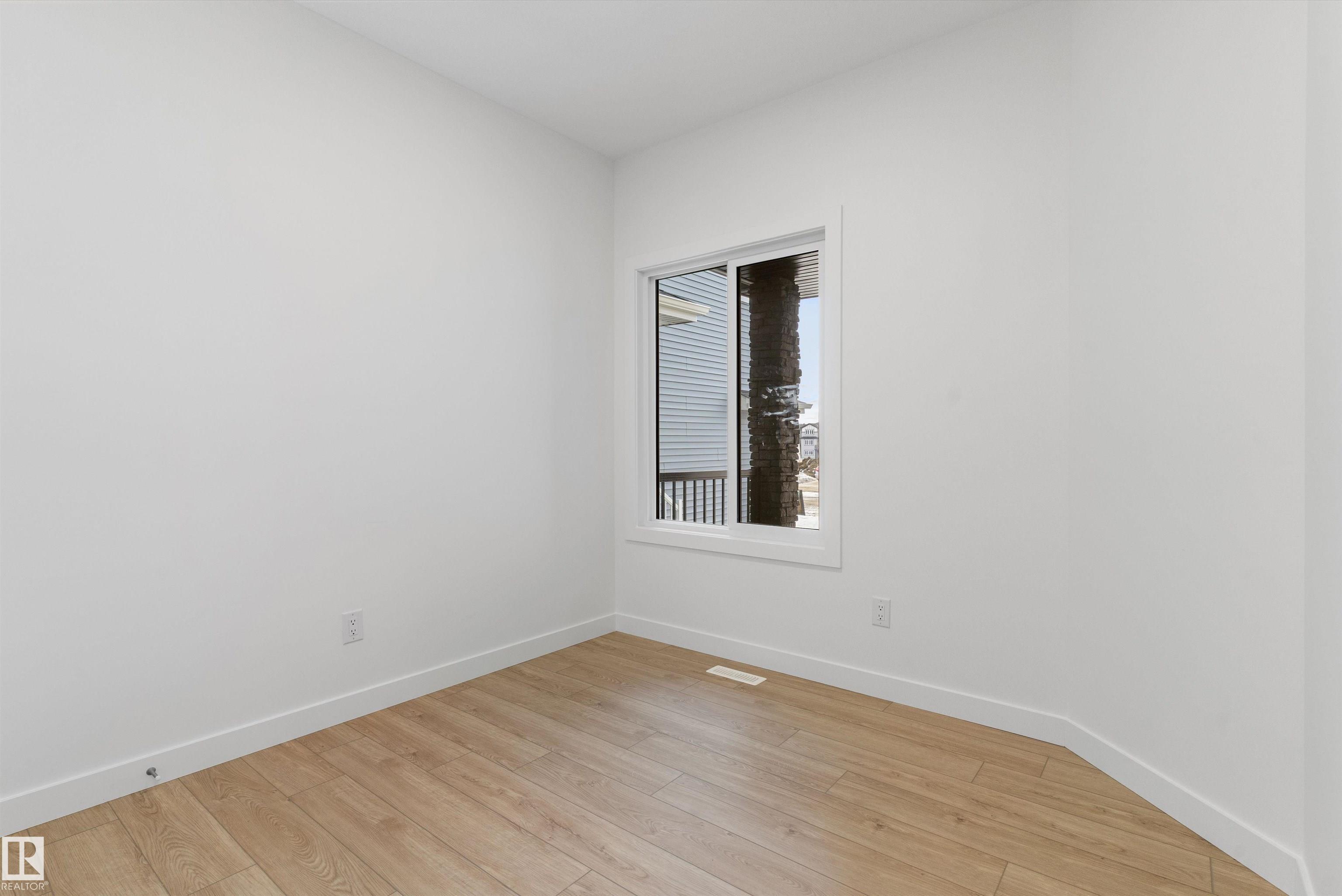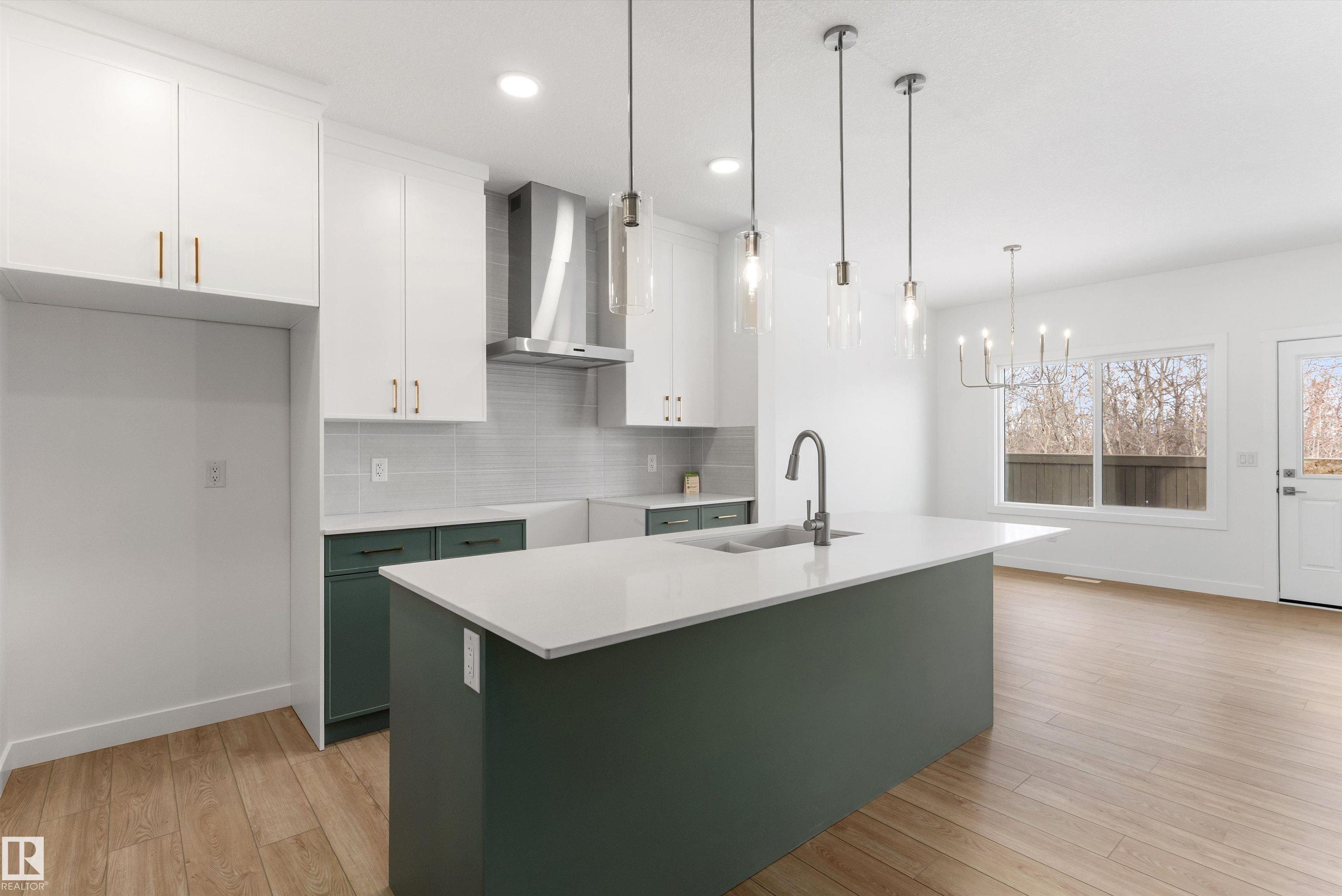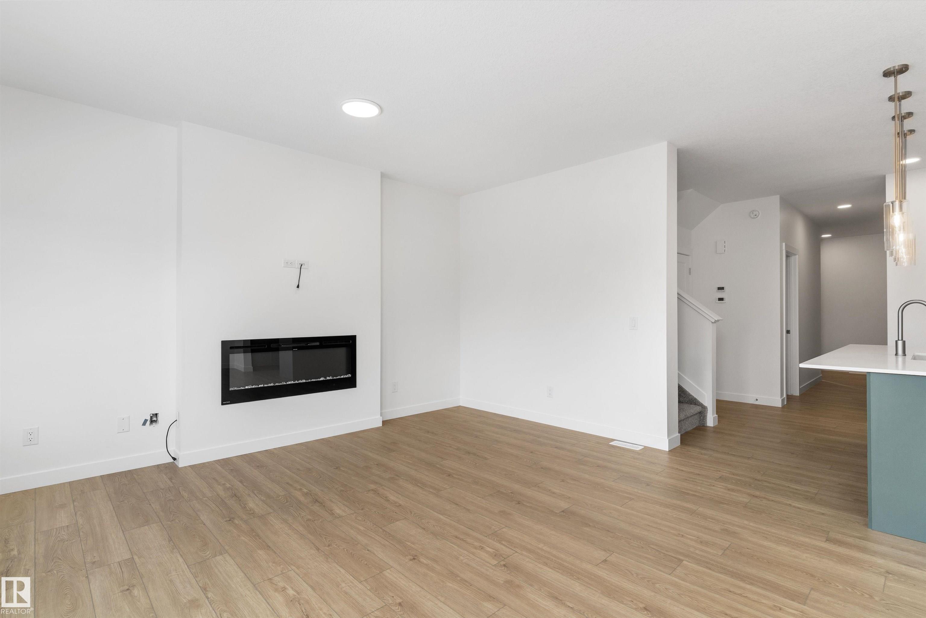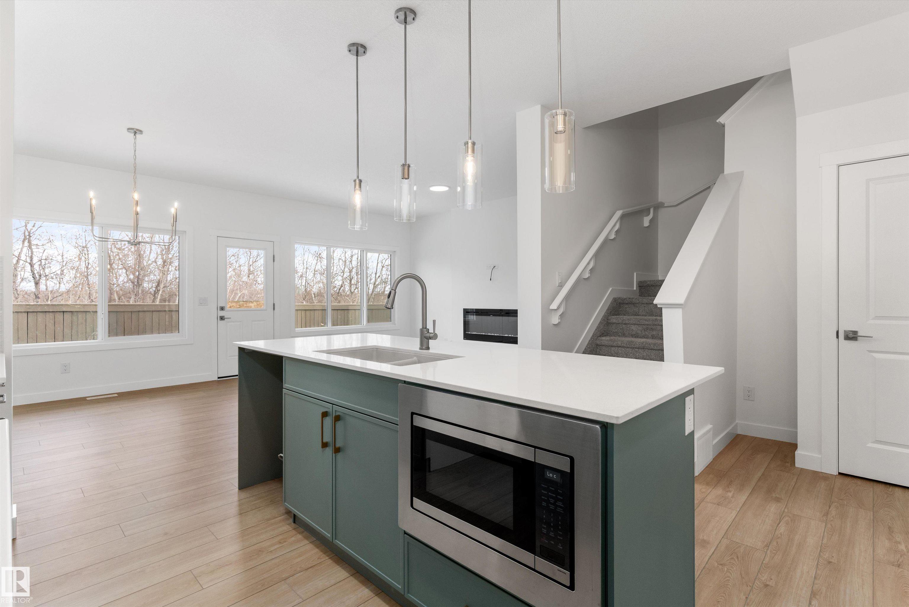 Built by Sterling Homes, this front-attached home in College Woods at Lakeview offers bright, modern living near trails, greenspace, and natural calm. Triple-pane windows and 9? ceilings fill the open-concept main floor with light, from the foyer to the spacious great room with electric fireplace. The kitchen features quartz countertops, a large island, ceiling-height cabinetry with crown moulding, chimney hood fan, built-in microwave, and corner pantry?ideal for daily living and entertaining. A garden door opens to the backyard with a convenient half bath on the main level. Upstairs, the primary suite includes a walk-in closet and 4-piece ensuite with double sinks and glass shower. A central bonus room, upper laundry, full bath, and two bedrooms complete the layout. Finished with luxury vinyl plank flooring, upgraded railings, side entrance, double attached garage with floor drain, and basement rough-ins, this home offers comfort in a peaceful, nature-inspired community.