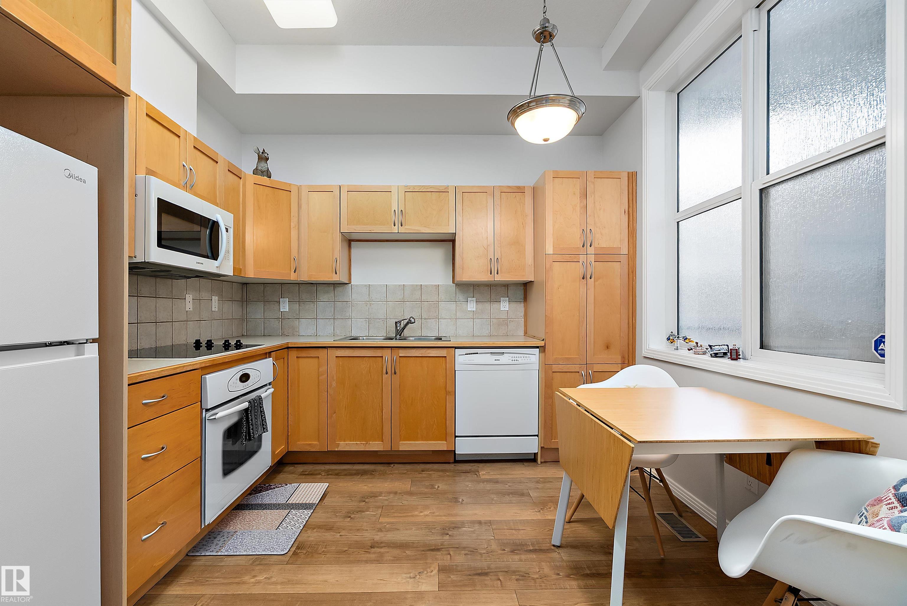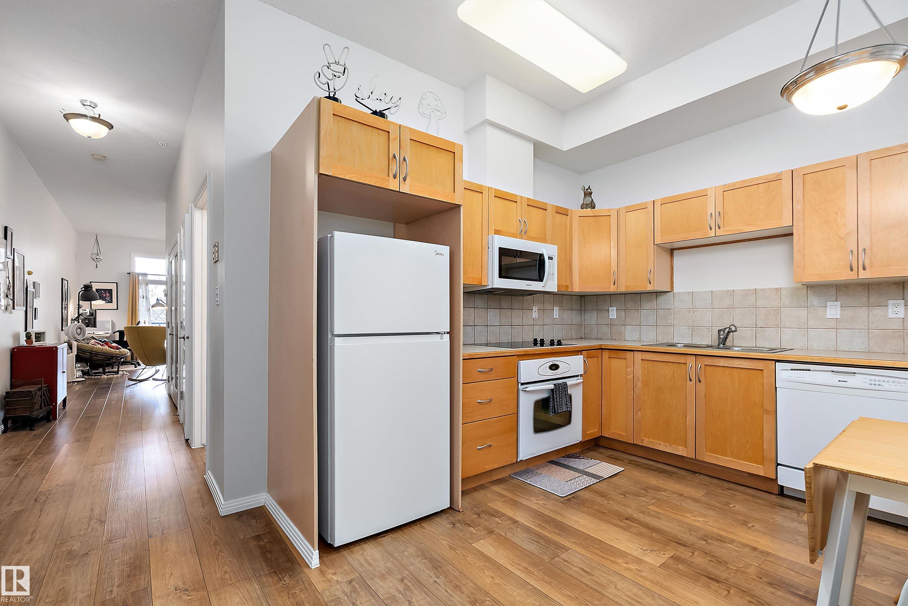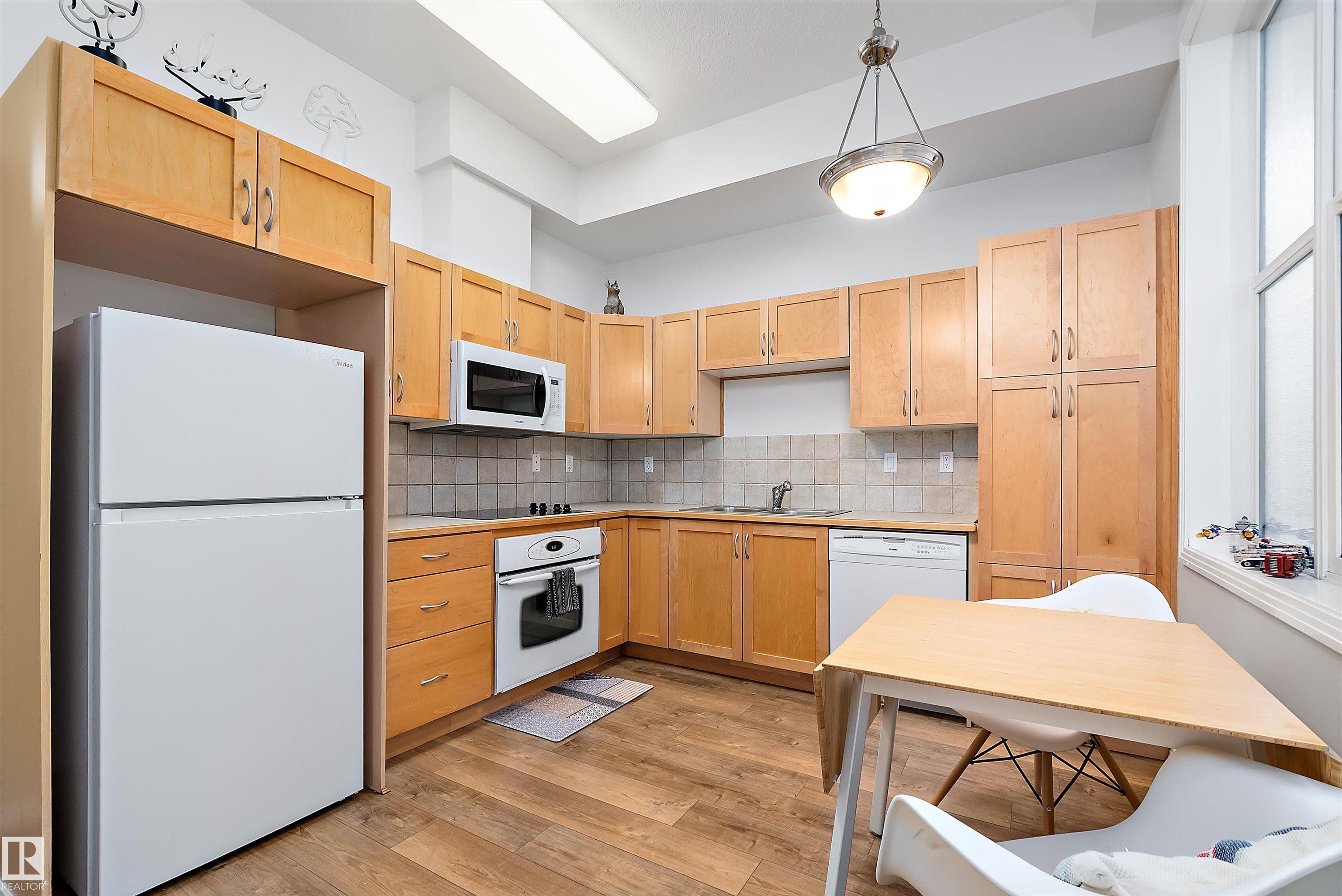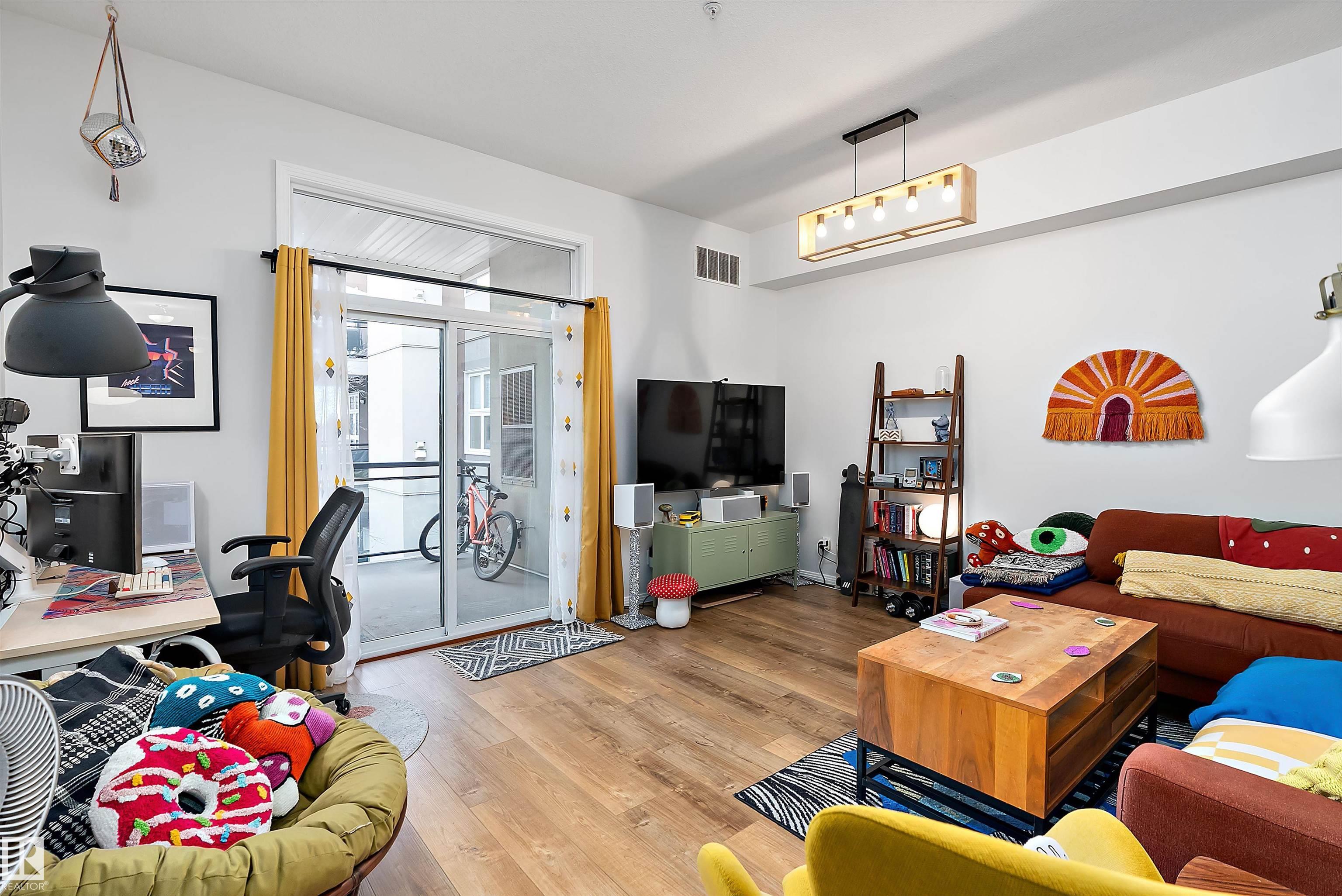 Welcome to Glenora Gates ? where urban convenience meets Westmount charm. This trendy one-bedroom condo showcases soaring ceilings and large windows that create a bright, airy atmosphere. The thoughtfully designed layout feels spacious and comfortable, highlighted by stylish finishes, modern lighting, and contemporary design touches that give the home an on-trend feel. The kitchen offers ample cabinetry and prep space. The inviting living area opens to your private covered balcony ? perfect for morning coffee or evening unwinding. Enjoy the convenience of in-suite laundry with a full-sized stacked washer and dryer, plus heated underground parking with a dedicated storage unit, secure building access, and visitor parking. An unbeatable central location just minutes to downtown, NAIT, MacEwan, the Brewery District, 124 Street boutiques and dining, parks, transit, and the river valley makes this an ideal home for students, professionals, or investors seeking stylish, low-maintenance living.