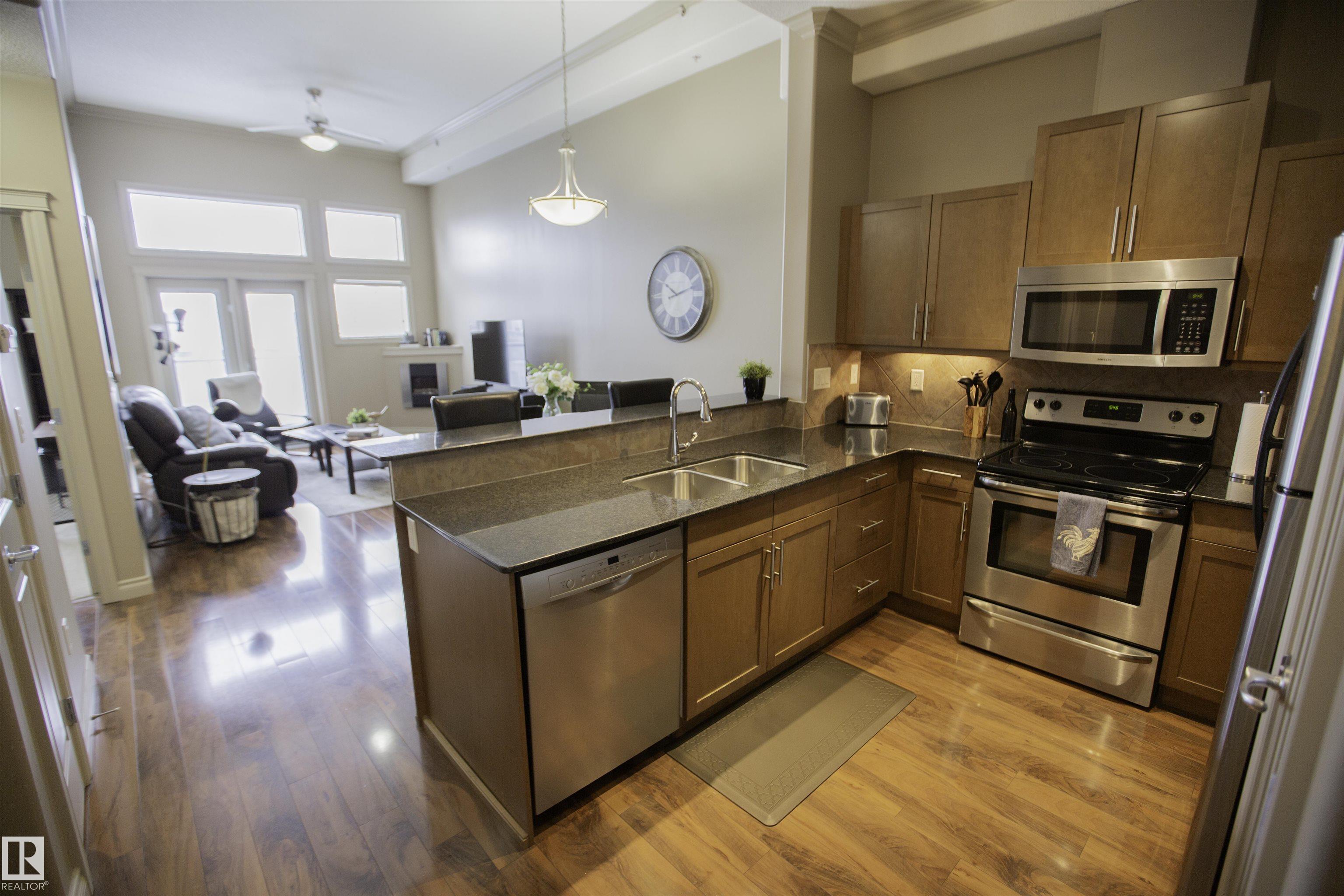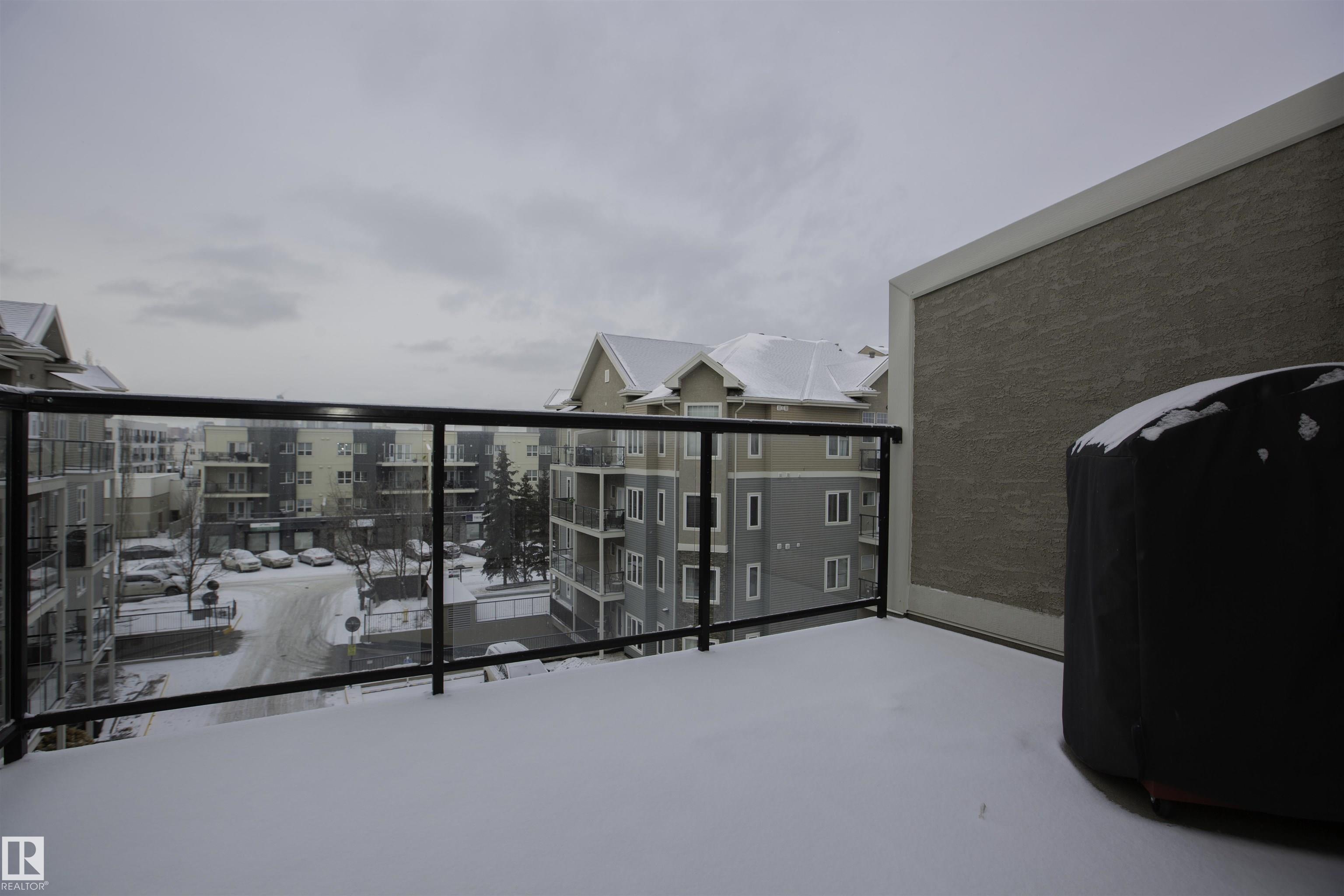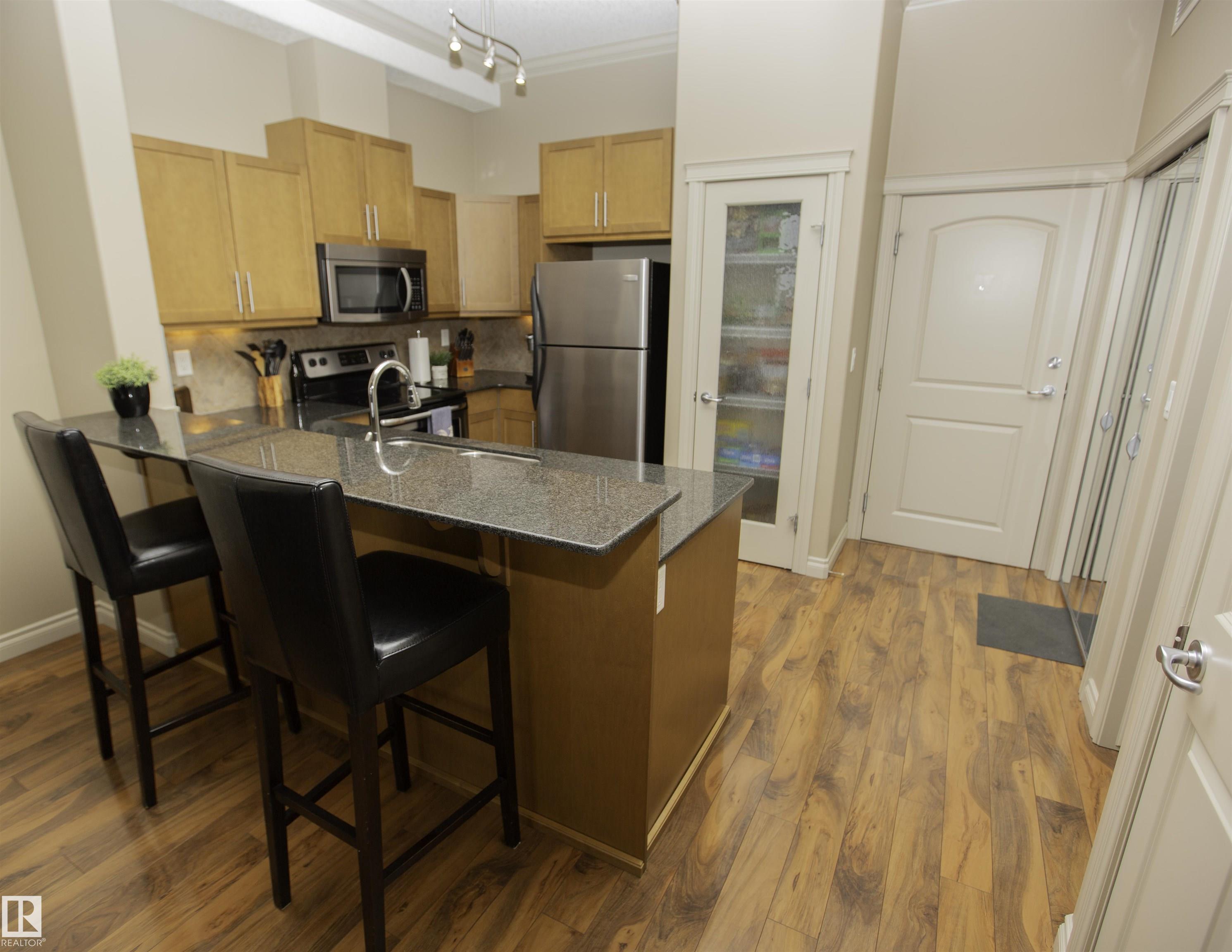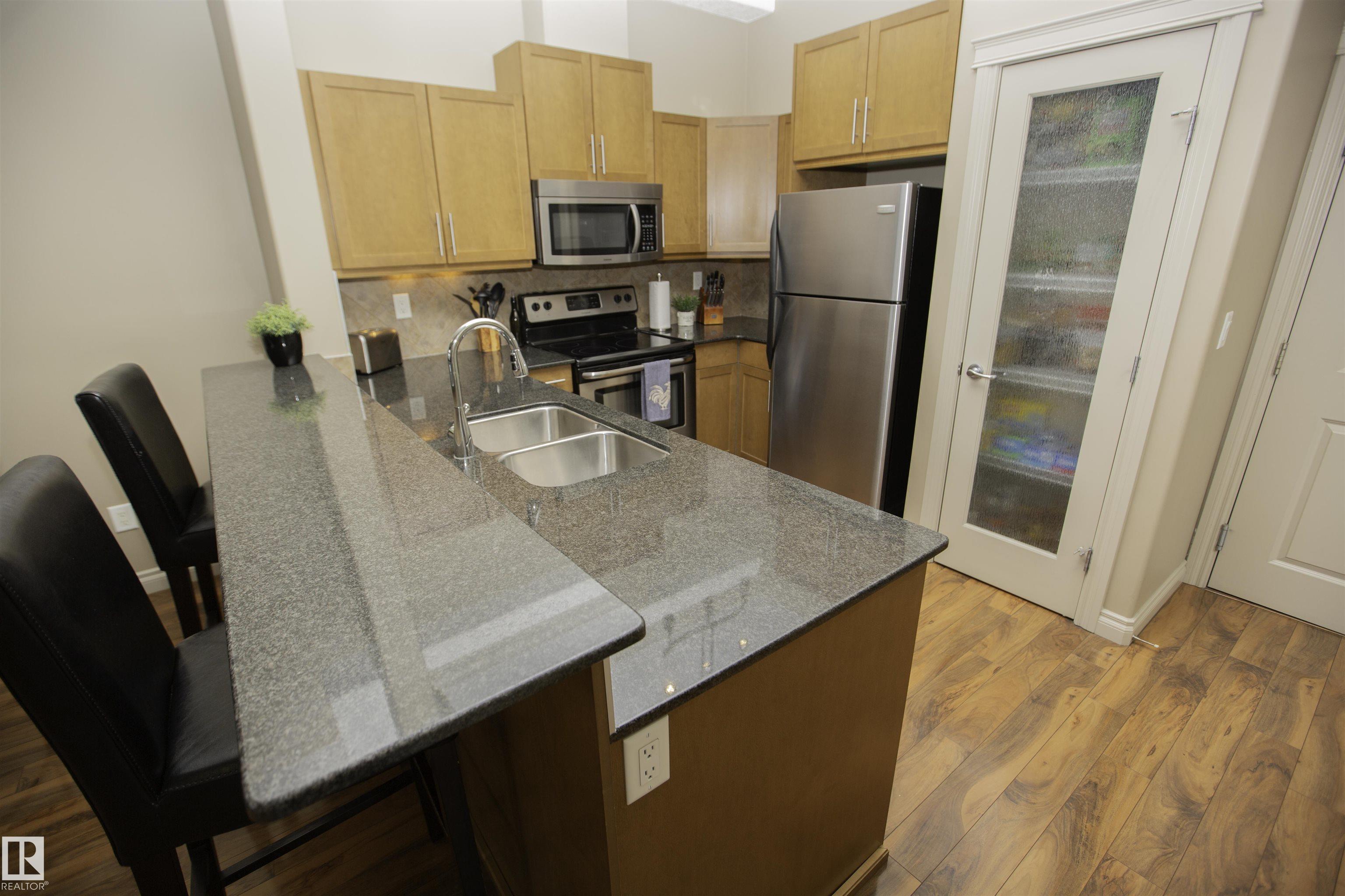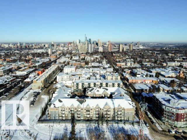 Executive Penthouse in Scona Gardens! This top floor unit boasts a contemporary floor plan with 12 & 14 FT ceilings, crown molding and granite counters throughout. The lovely kitchen overlooks the dining area and features a 4 person breakfast bar, espresso maple cabinets, lrg pantry and stainless steel appliances that include a stove, built in microwave w hood fan, fridge & dishwasher. Cozy electric fireplace in the living room, an East facing balcony with courtyard views and a gas bbq outlet. SPACIOUS MASTER BDRM features a walk through wardrobe and private entrance to the 4 pc bathroom. In-suite washer/dryer, titled underground parking w storage space. Building is soundproofed and amenities include an exercise room, social room, guest suite, heated underground visitor parking, car wash bay and a beautiful courtyard. Come check out this gorgeous condo today! Located only 2 blocks away from Whyte Ave, and a short walk from the U of A and the Old Strathcona Farmer's Market.