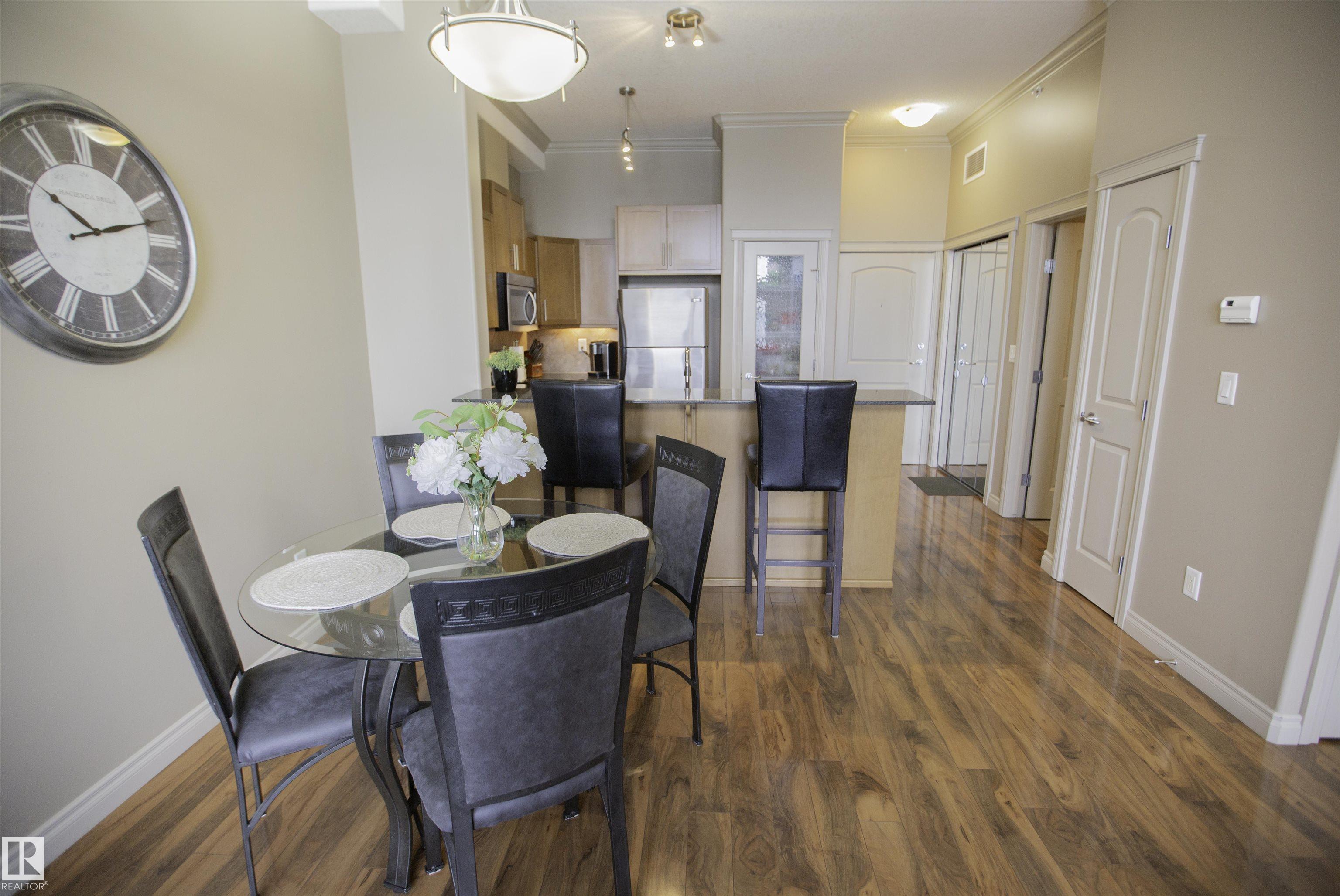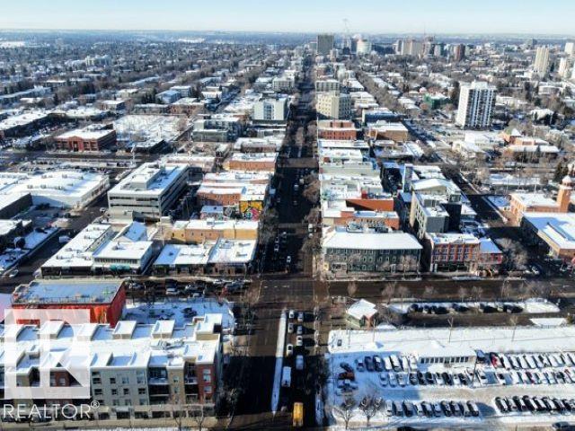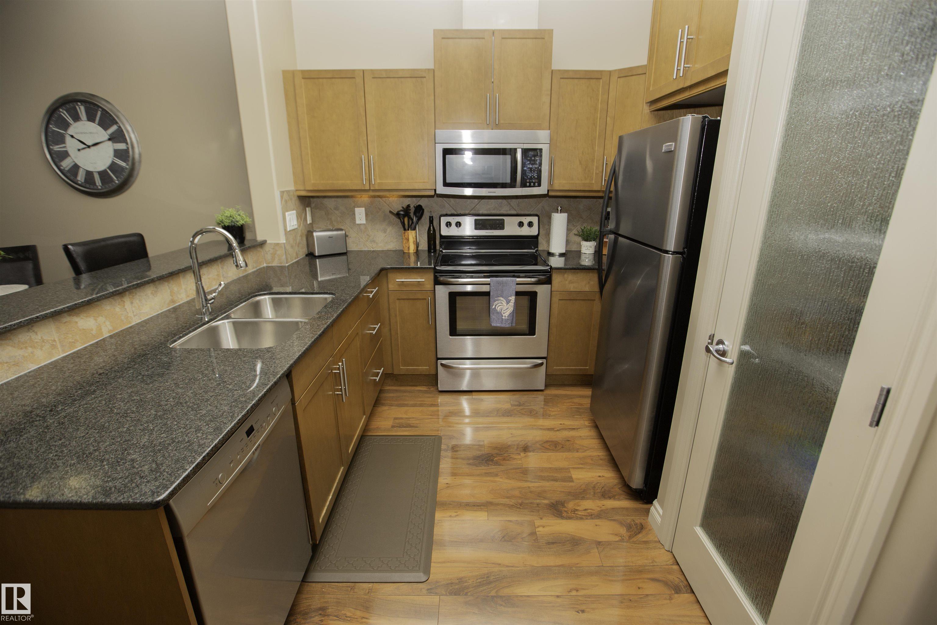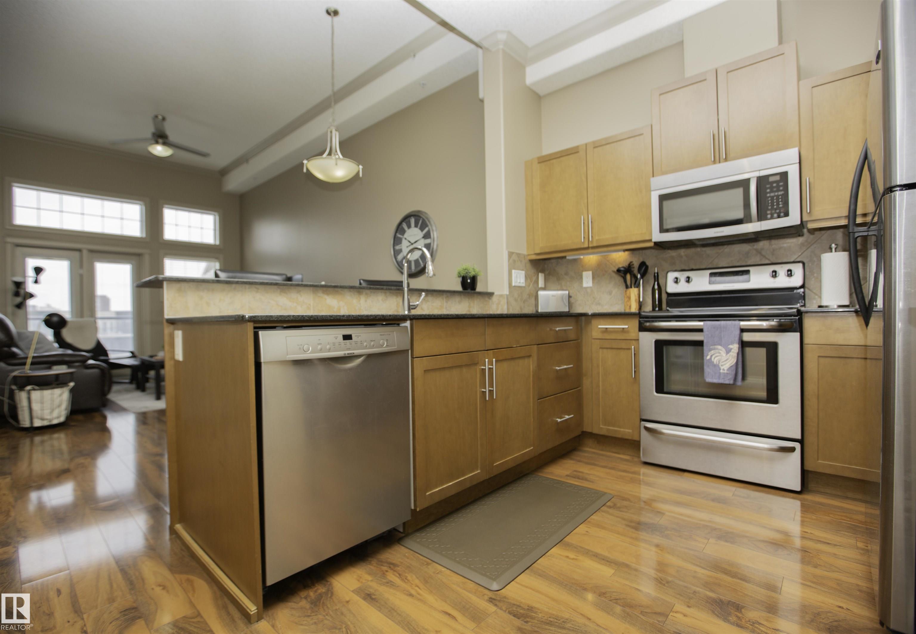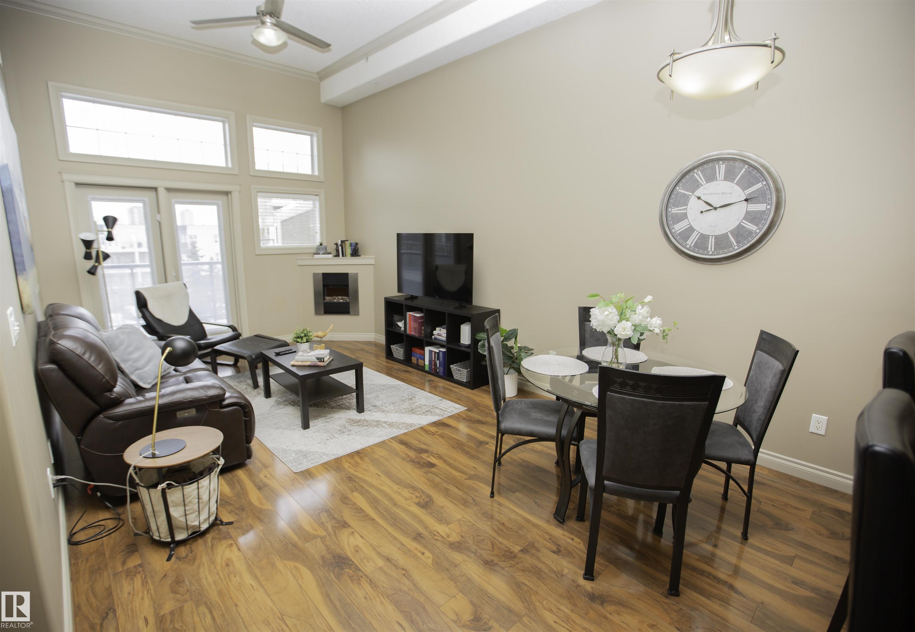 Executive Penthouse in Scona Gardens! This top floor unit boasts a contemporary floor plan with 12 & 14 FT ceilings, crown molding and granite counters throughout. The lovely kitchen overlooks the dining area and features a 4 person breakfast bar, espresso maple cabinets, lrg pantry and stainless steel appliances that include a stove, built in microwave w hood fan, fridge & dishwasher. Cozy electric fireplace in the living room, an East facing balcony with courtyard views and a gas bbq outlet. SPACIOUS MASTER BDRM features a walk through wardrobe and private entrance to the 4 pc bathroom. In-suite washer/dryer, titled underground parking w storage space. Building is soundproofed and amenities include an exercise room, social room, guest suite, heated underground visitor parking, car wash bay and a beautiful courtyard. Come check out this gorgeous condo today! Located only 2 blocks away from Whyte Ave, and a short walk from the U of A and the Old Strathcona Farmer's Market.