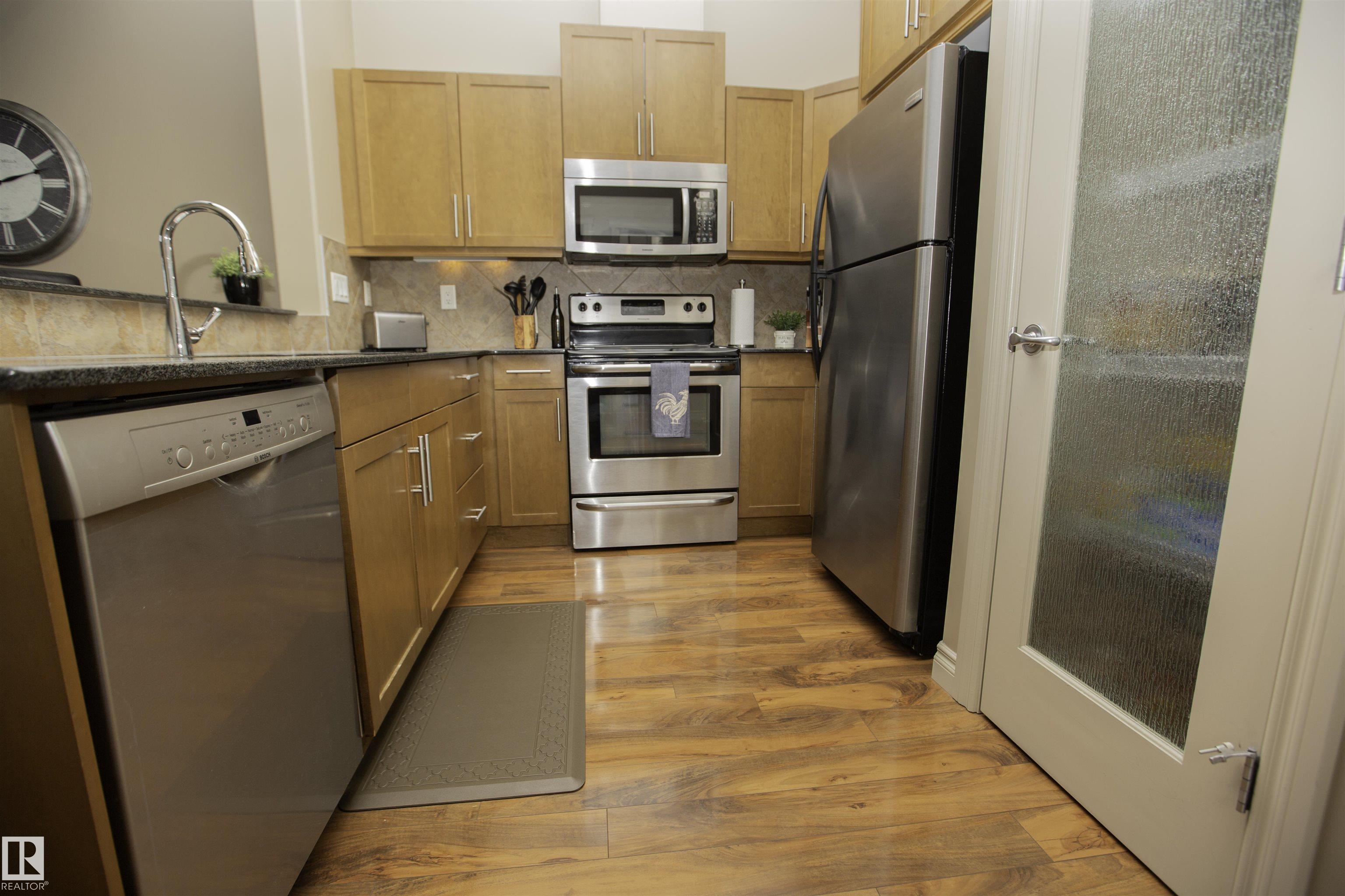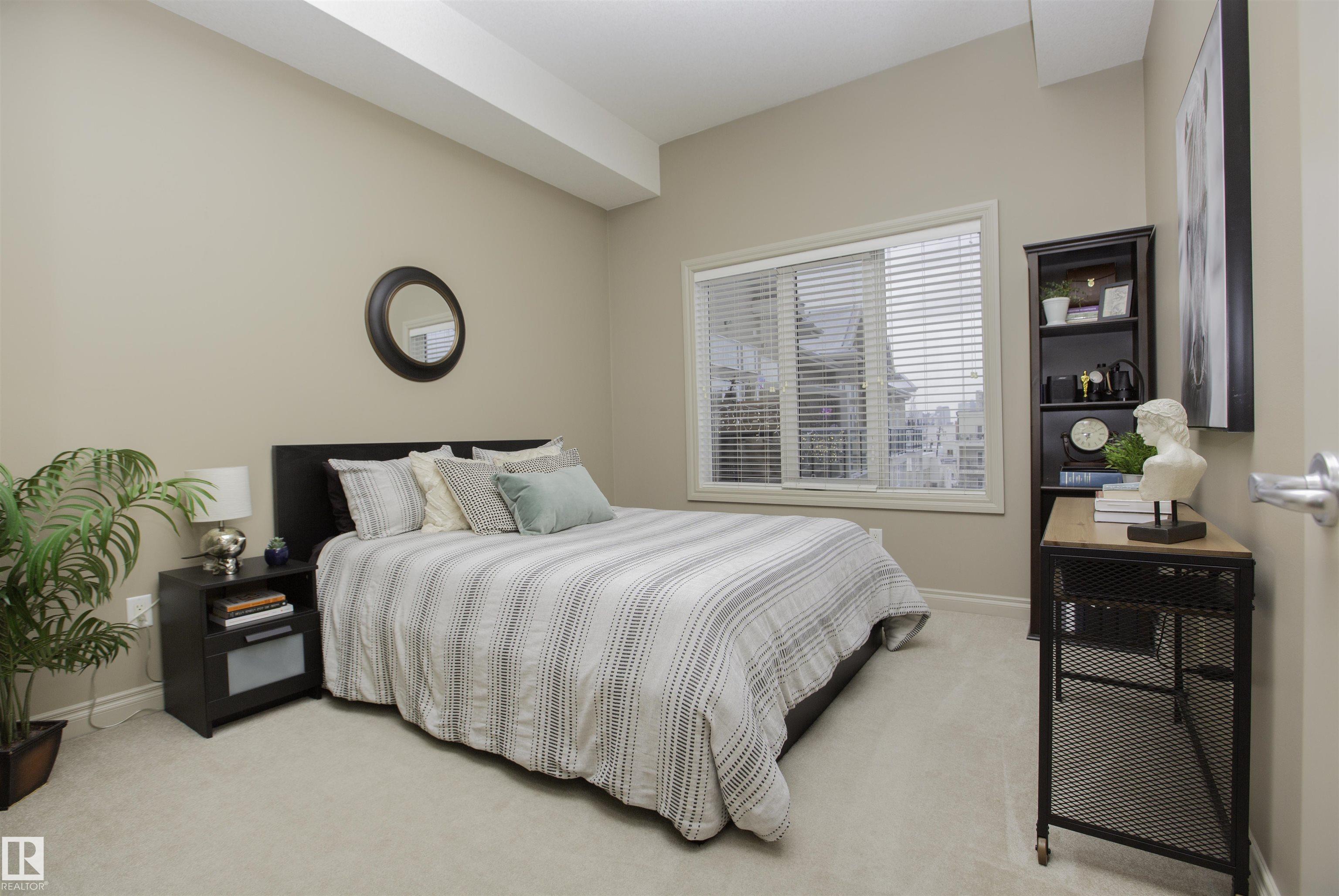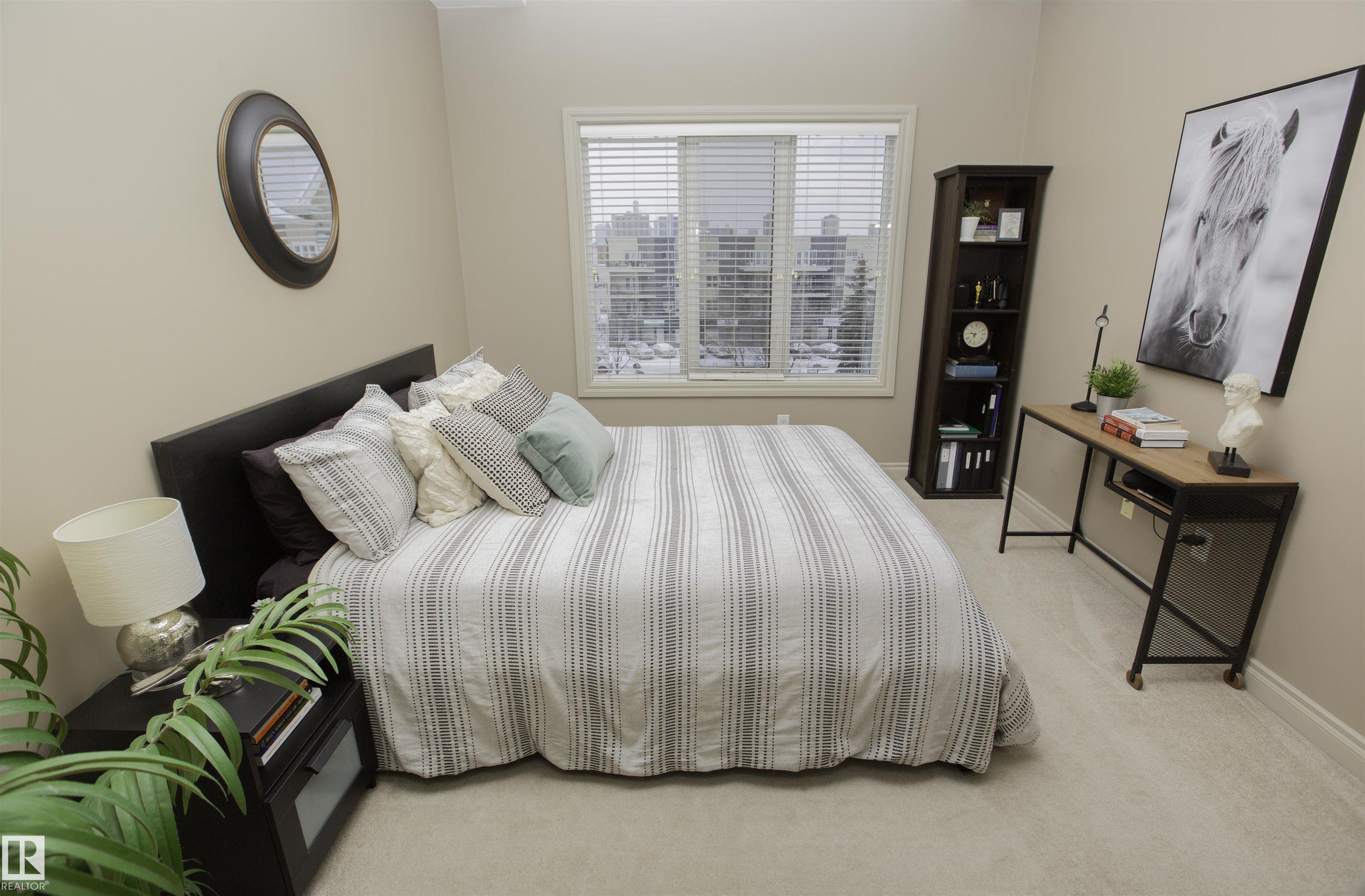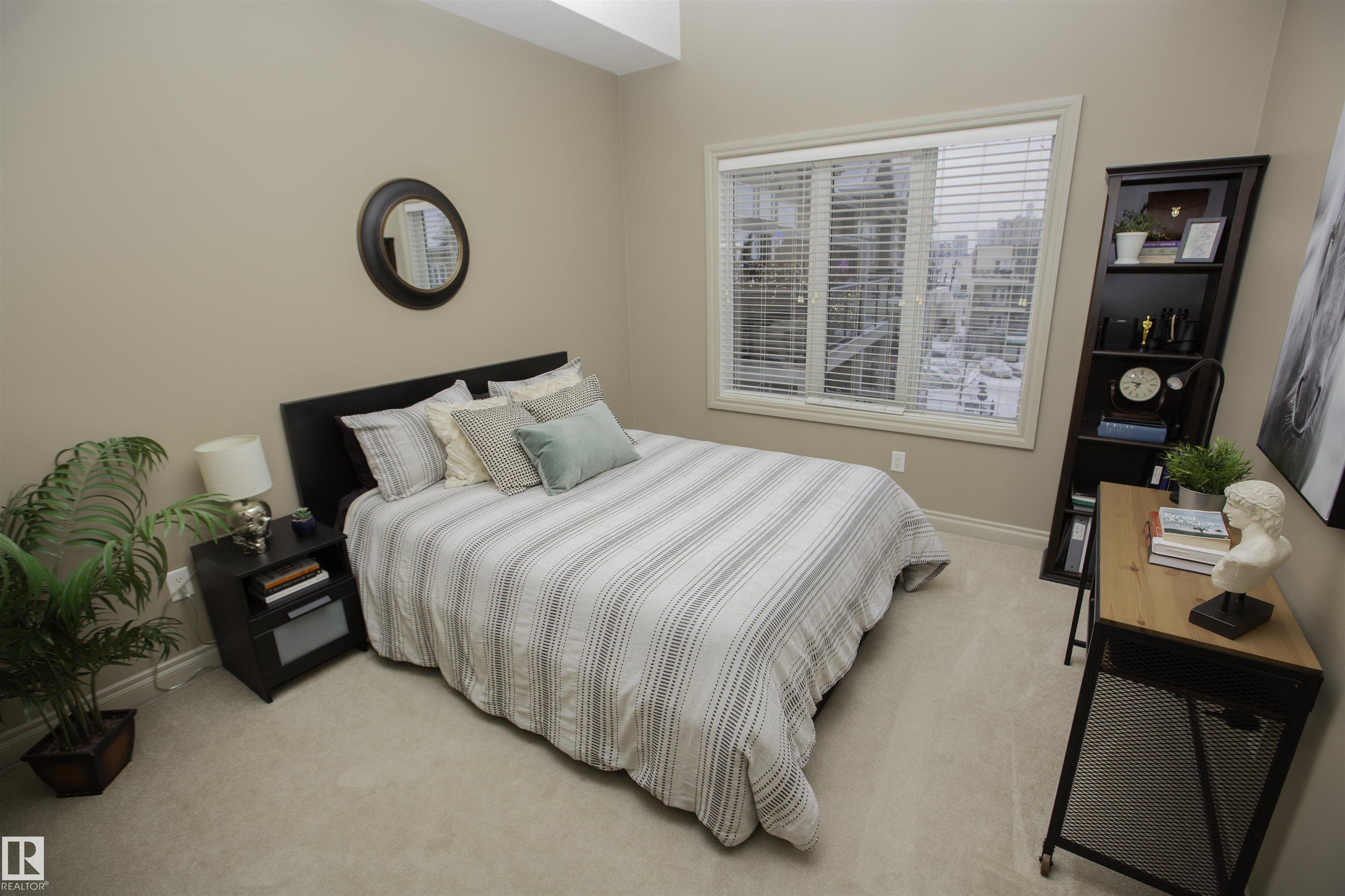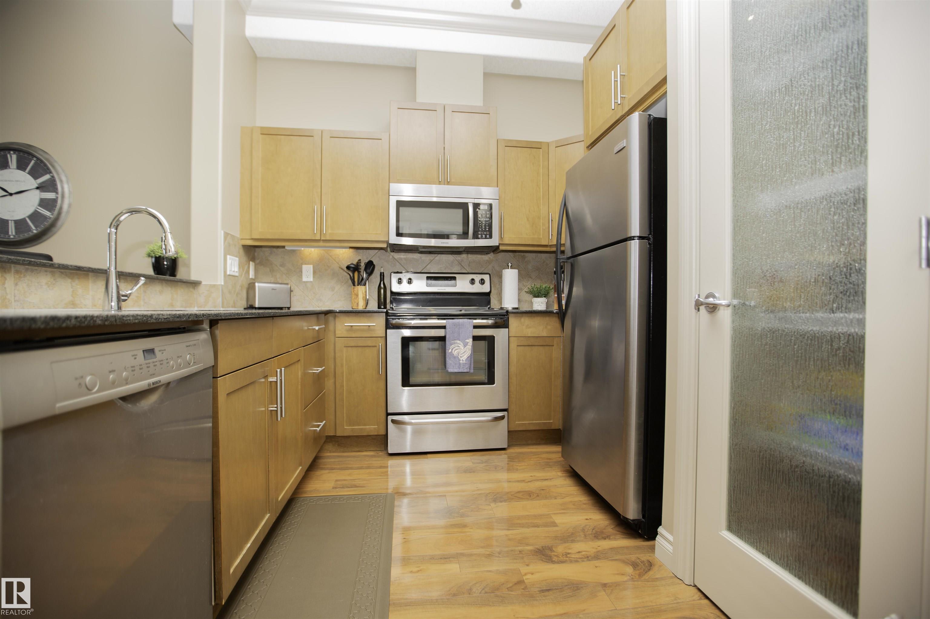 Executive Penthouse in Scona Gardens! This top floor unit boasts a contemporary floor plan with 12 & 14 FT ceilings, crown molding and granite counters throughout. The lovely kitchen overlooks the dining area and features a 4 person breakfast bar, espresso maple cabinets, lrg pantry and stainless steel appliances that include a stove, built in microwave w hood fan, fridge & dishwasher. Cozy electric fireplace in the living room, an East facing balcony with courtyard views and a gas bbq outlet. SPACIOUS MASTER BDRM features a walk through wardrobe and private entrance to the 4 pc bathroom. In-suite washer/dryer, titled underground parking w storage space. Building is soundproofed and amenities include an exercise room, social room, guest suite, heated underground visitor parking, car wash bay and a beautiful courtyard. Come check out this gorgeous condo today! Located only 2 blocks away from Whyte Ave, and a short walk from the U of A and the Old Strathcona Farmer's Market.