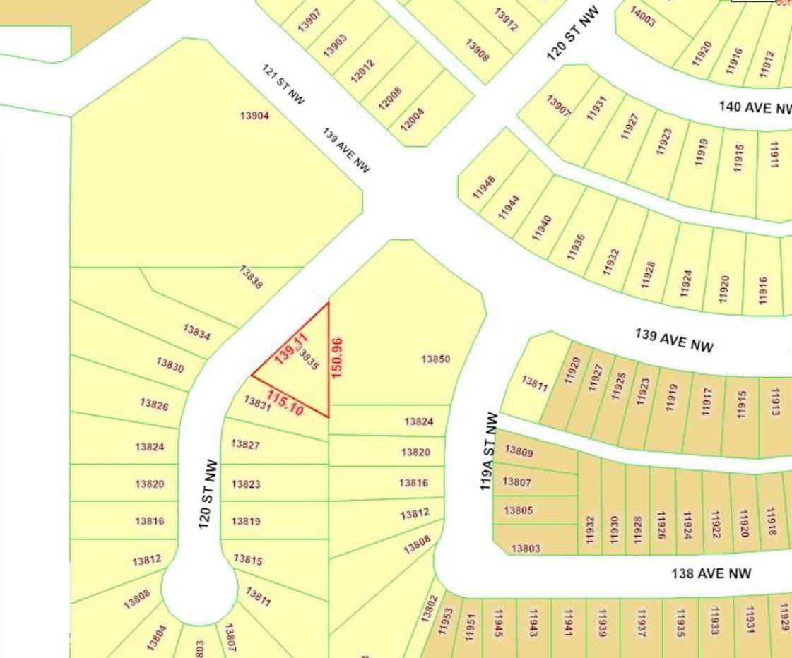 Rare infill opportunity in Carlisle! This oversized 7,600 sq. ft. (706.15 SqM) pie-shaped lot sits in a quiet cul-de-sac within a mature, family-friendly community?an ideal setting for redevelopment. Generous lot size and unique shape offer flexibility for new build potential. Surrounded by established homes, top schools, beautiful parks (Carlisle Park), and major shopping (The Home Depot, Walmart, Superstore, Lucky Supermarket, Best Buy), cafes, restaurants, movie theater, with transit within walking distance. Quick connectivity to the Anthony Henday, and downtown Edmonton terrific long-term value. Prime land in a proven location. Zoning: 2.10 RS - Small Scale Residential Zone. The Property is being sold as is, where is.