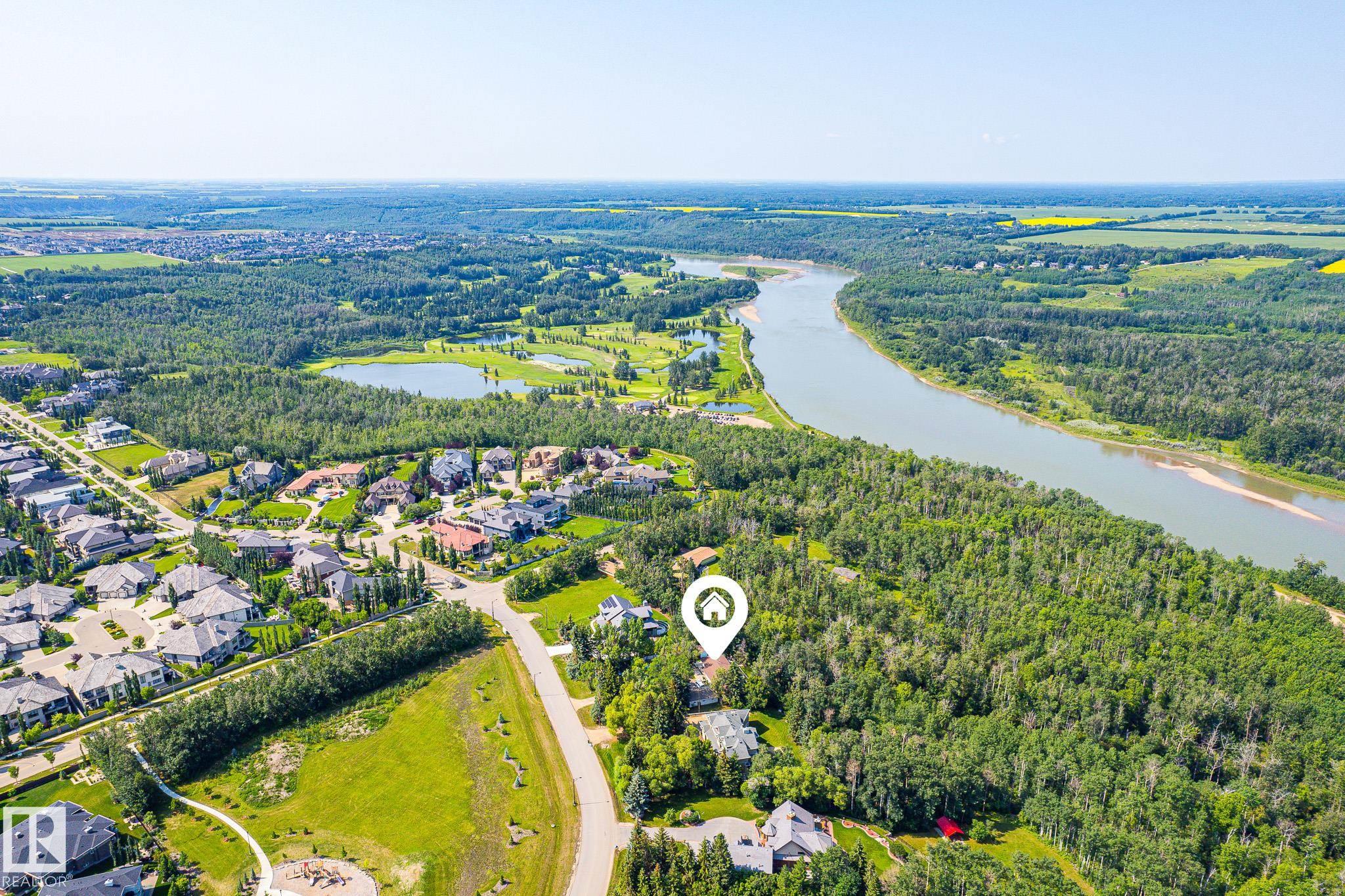 Prestigious country-living right in the city with the opportunity to build your dream home without any compromises. WALKOUT BASEMENT home, a private and secluded PANORAMIC VIEW of the river, river valley and River Ridge golf course, high atop the banks of the North Saskatchewan River. 4,837.10 m2 / 1.2 acres beautiful park like acreage. 4 Bedrooms, 3 Baths. Master with Ensuite and oversized private outdoor deck with the most EXQUISITE VIEW! Main Floor includes large GREAT ROOM, DINING ROOM, KITCHEN and over 1,000 sq.ft deck. Lower WALKOUT level includes large family ROOM and GAMES ROOM, SUITE including 4th BEDROOM, Triple car garage! No walking trail at the back for extra privacy. One of the best lots in the city. A must see.