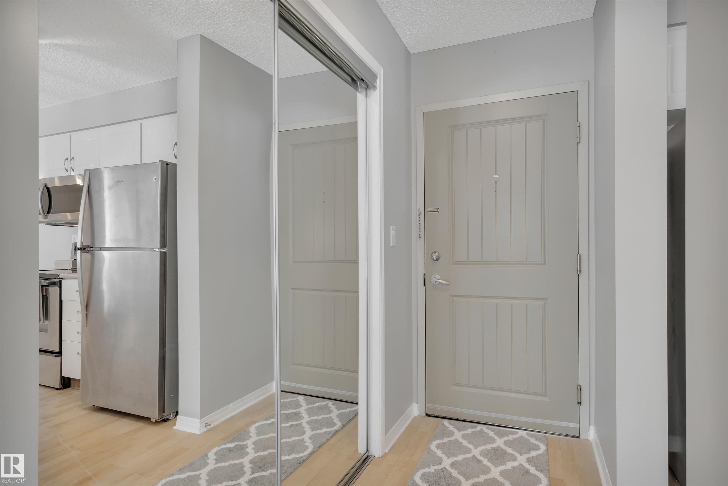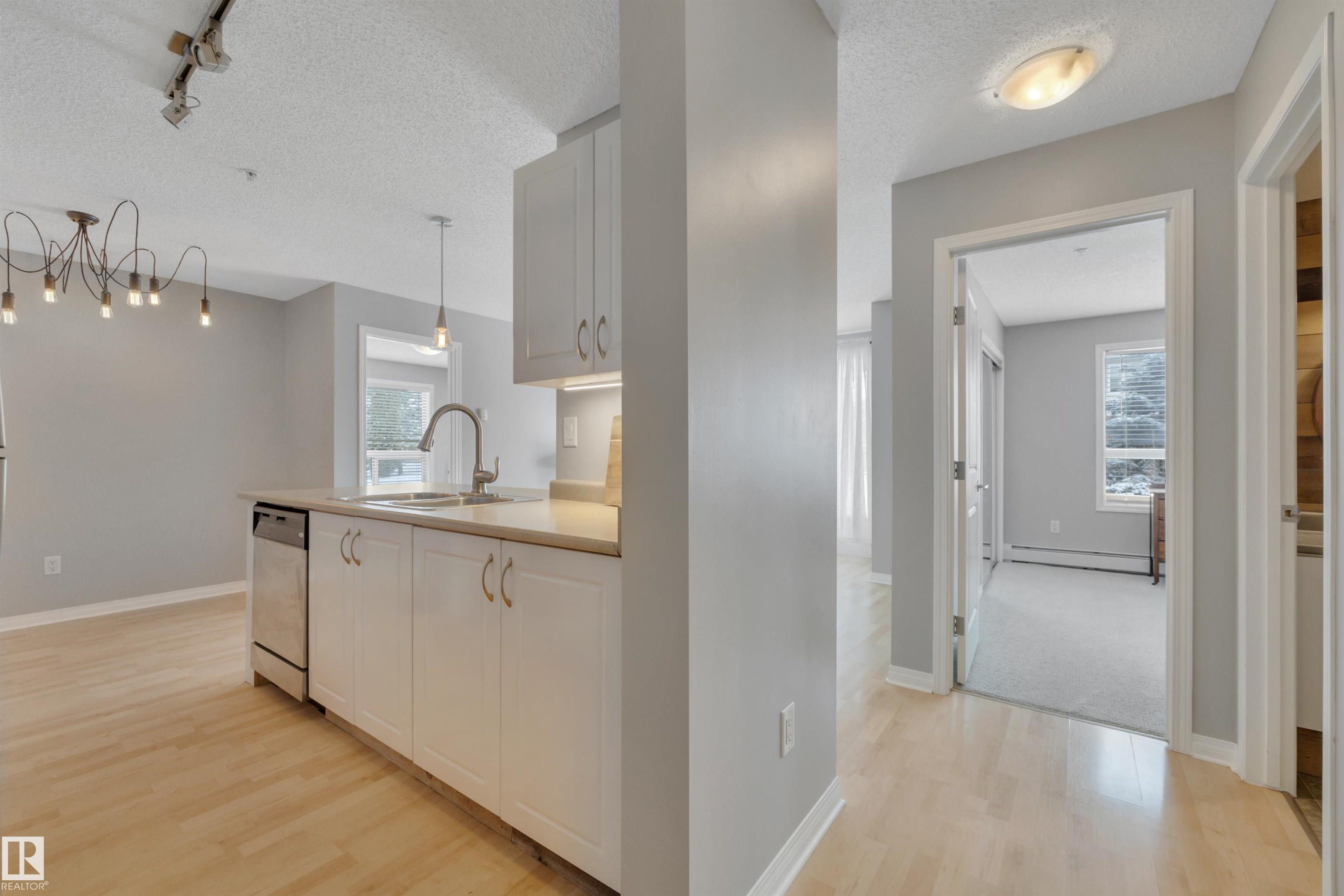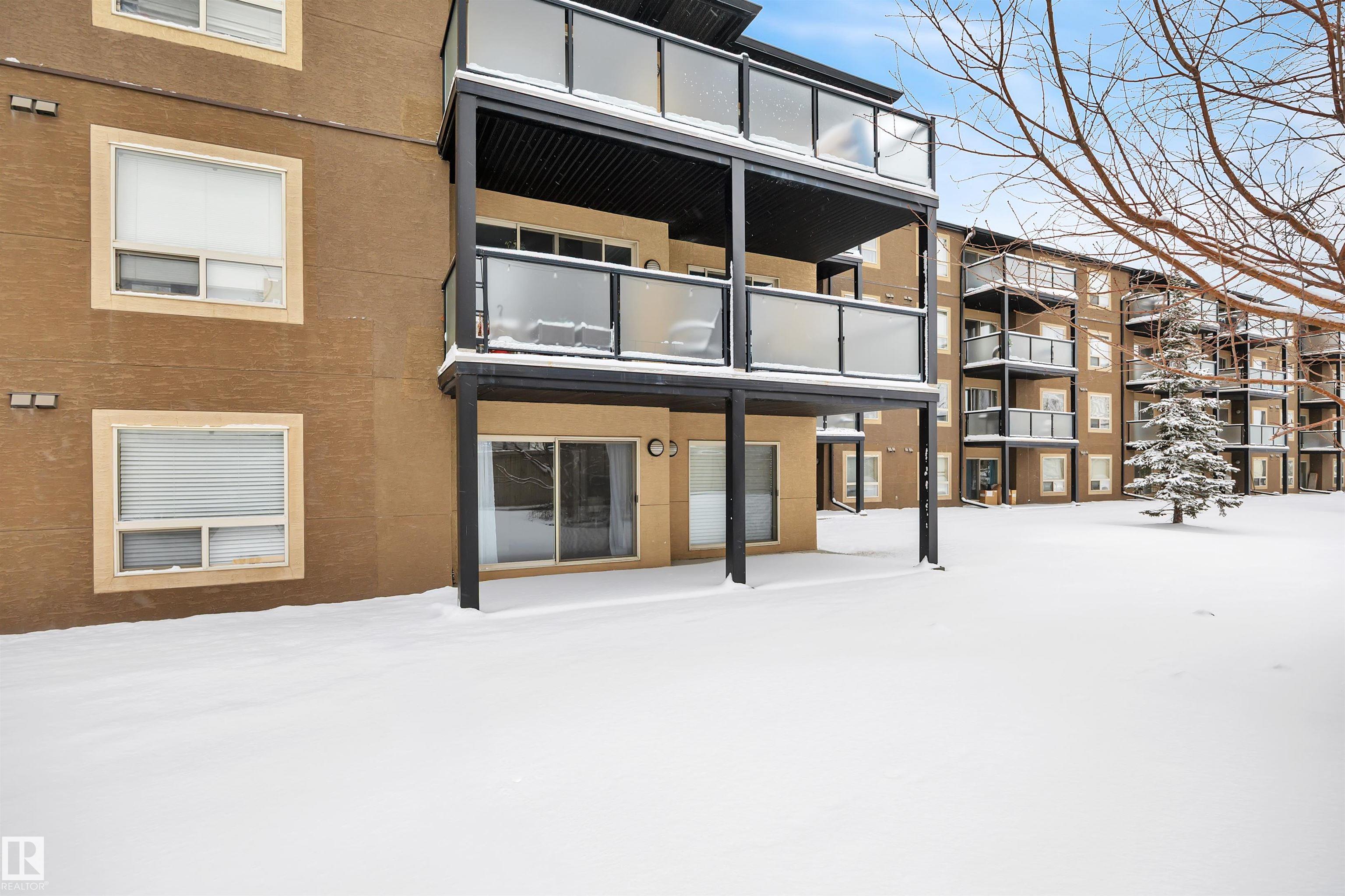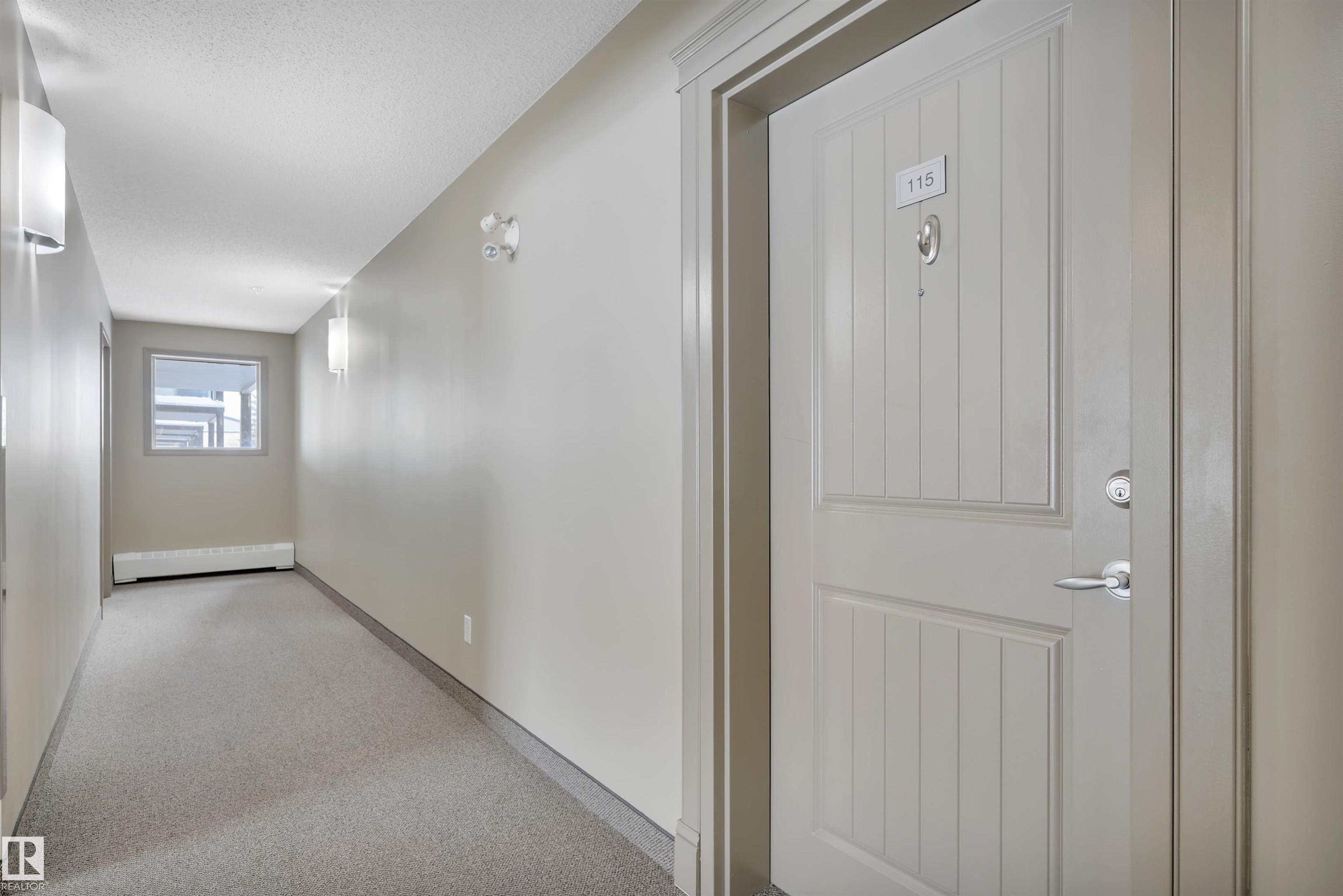 Welcome to Hudson Village,where comfort meets quiet community living. This 2 bedroom, 2 bath ground-floor corner unit backs onto a beautifully landscaped yard and a peaceful residential area, offering a tranquil setting rarely found in condo living. Freshly painted in neutral tones, the home features laminate flooring throughout the main living areas with newer carpeting in the bedrooms. The bright kitchen includes white cabinetry, a neutral countertop, and stainless steel appliances, with a newer fridge and over-the-range microwave. A separate laundry and storage room adds convenience. Both bathrooms feature rustic shiplap accents, creating a warm cabin-inspired vibe in the city, complemented by upgraded light fixtures, white doors and trim, new hardware, and 2-inch slat blinds throughout. Step outside to the private concrete corner patio, where you can open the windows and listen to birds in the trees while enjoying the peaceful surroundings. Heated underground parking stall steps from the elevator.