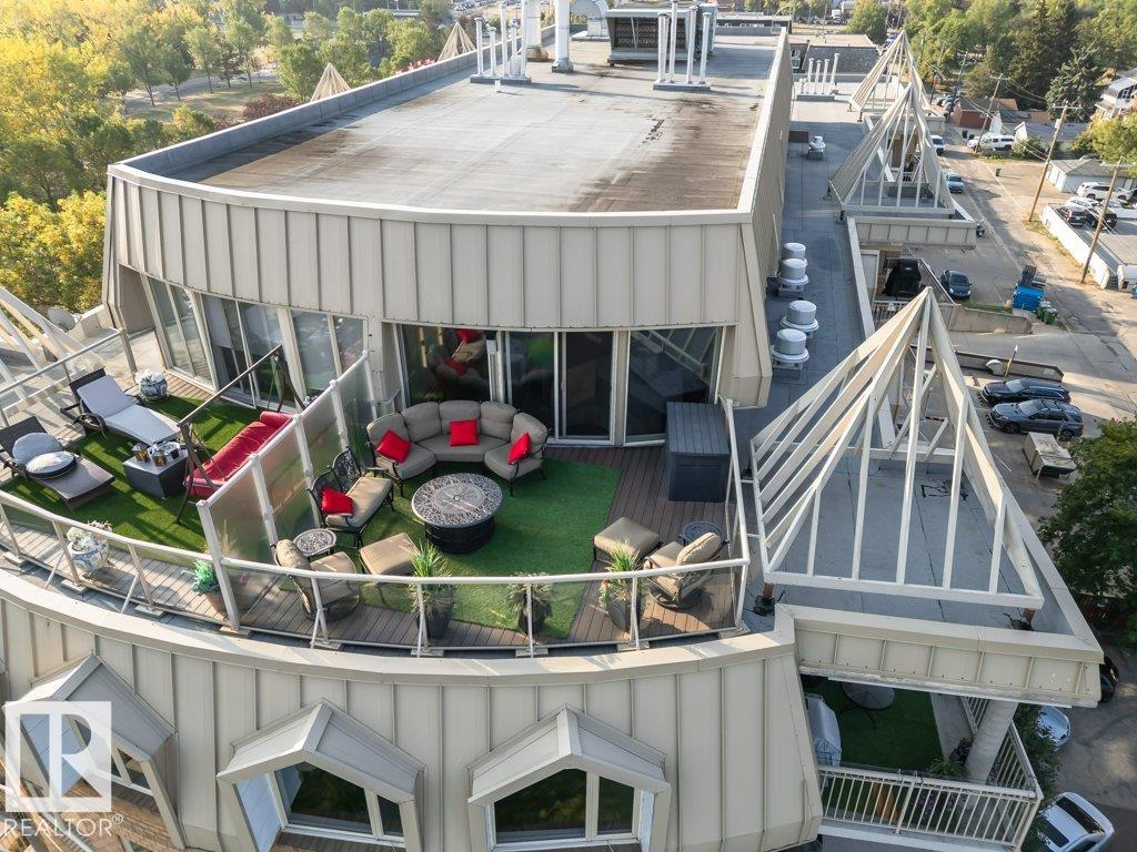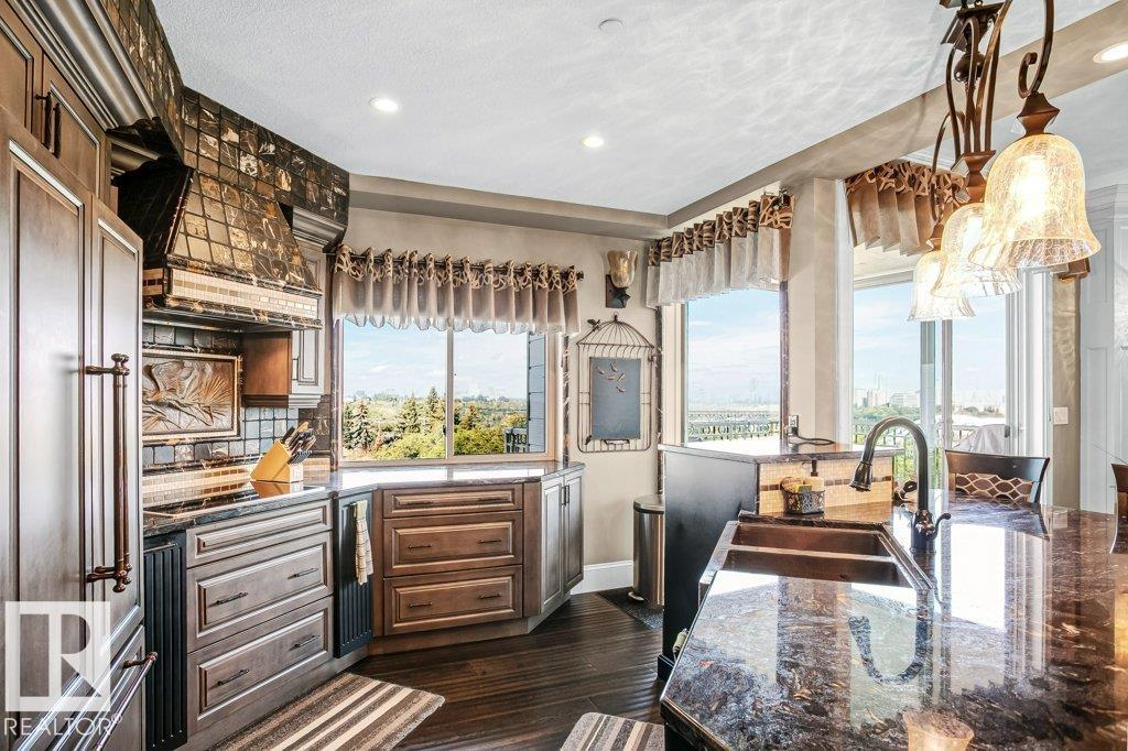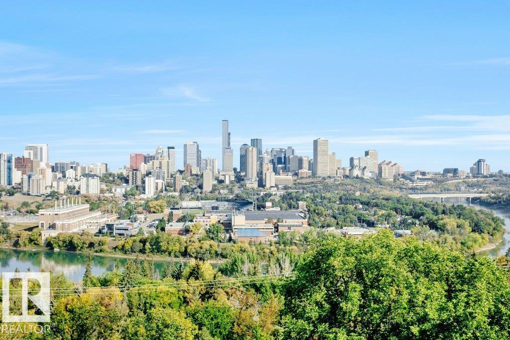 PENTHOUSE UNDER $1M! Breathtaking views from this fully renovated 2-storey residence on prestigious Saskatchewan Dr. Offering 2 bedrooms, 2 baths & 2 u/g stalls, this pet friendly home delivers exceptional value with river valley & downtown views from every window. Over 2,190 sq ft plus 2 balconies, ideal for entertaining & summer evenings. Chef-inspired kitchen with built-in appliances, massive granite island, custom backsplash & walk-in pantry. Open concept layout with bright living rm, panoramic views & spacious dining area. Features include fireplace, motorized blinds, hand-scraped hardwood, in-floor heating, A/C, modern lighting & built-in sound.Main floolr primary suite with in-suite laundry & spa-like baths finished in marble, glass & mosaic tile. Upper level offers family room with custom bar, built-in office & balcony access overlooking the skyline. Rare opportunity in a premier location.